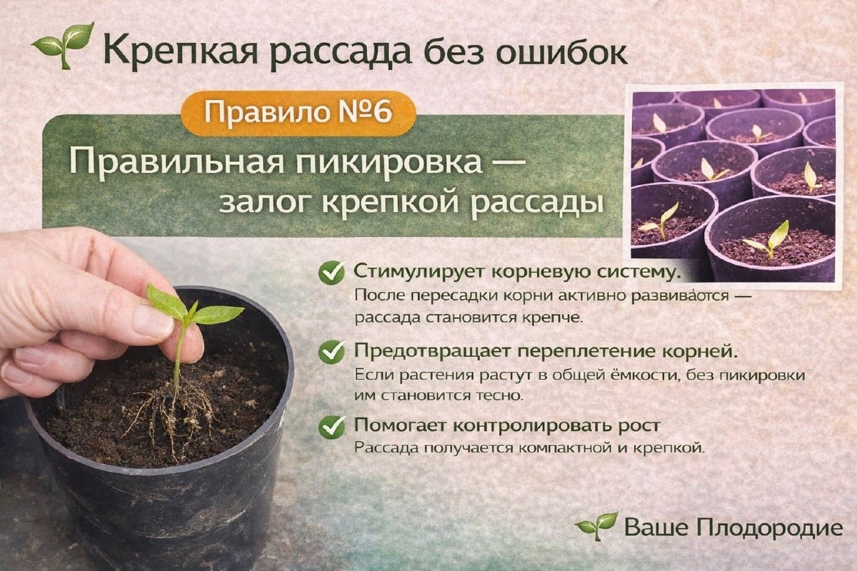 ПРАВИЛО N6 — ПРАВИЛЬНАЯ ПИКИРОВКА Пикировка – процесс пересадки молодых растений в отдельные ёмкости или просторные горшки. Делать или нет? Разбираемся вместе. ❗️Пикировка — важный шаг на пути к сильной и здоровой рассаде. 🌿 Почему пикировка важна? ✅ Стимулирует корневую систему. После пересадки корни активно развиваются — рассада становится крепче. ✅ Предотвращает переплетение корней. Если растения растут в общей ёмкости, без пикировки им становится тесно. ✅ Помогает контролировать рост. Рассада получается более компактной и устойчивой, меньше вытягивается. Итак, следующее правило выращивания крепкой рассады. 🥹 ✳️ Правило #️⃣6️⃣. Правильная пикировка — залог крепкой рассады. 👩🏻🌾 Своим опытом делится консультант магазина на Первомайской 76/1 Лидия Михайловна Красильникова💚⬇️. ❓🪴 Нужно ли обрезать корень? Классическая пикировка предполагает прищипывание главного корешка для стимуляции боковых корней. Но! Я корень не обрезаю, а просто аккуратно рассаживаю сеянцы по
