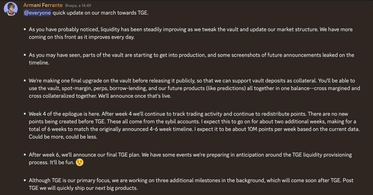 Глава Backpack, Армани, поделился важными новостями в Discord о развитии проекта и предстоящем TGE. ✨ Основные моменты: ▪️ Vaults получат финальное обновление, позволяющее использовать депозиты в качестве обеспечения. ▪️ Все продукты будут интегрированы в единый кросс-маржинальный и кросс-коллатеральный баланс. ▪️ Перераспределение сибил-поинтов продлится еще две недели. ▪️ Epilogue-фаза займет шесть недель, с еженедельным распределением около 10 млн поинтов. ▪️ Точный план TGE будет объявлен после завершения Epilogue. ▪️ К TGE готовятся специальные мероприятия, связанные с предоставлением ликвидности. Хотя конкретика по TGE пока отсутствует, команда действует разумно, учитывая текущую рыночную ситуацию. 💡 Напоминание: пройдите дополнительную верификацию на бирже. 🆙 Upscale – трейдинг, доступный каждому Первый челлендж Скидка 5%