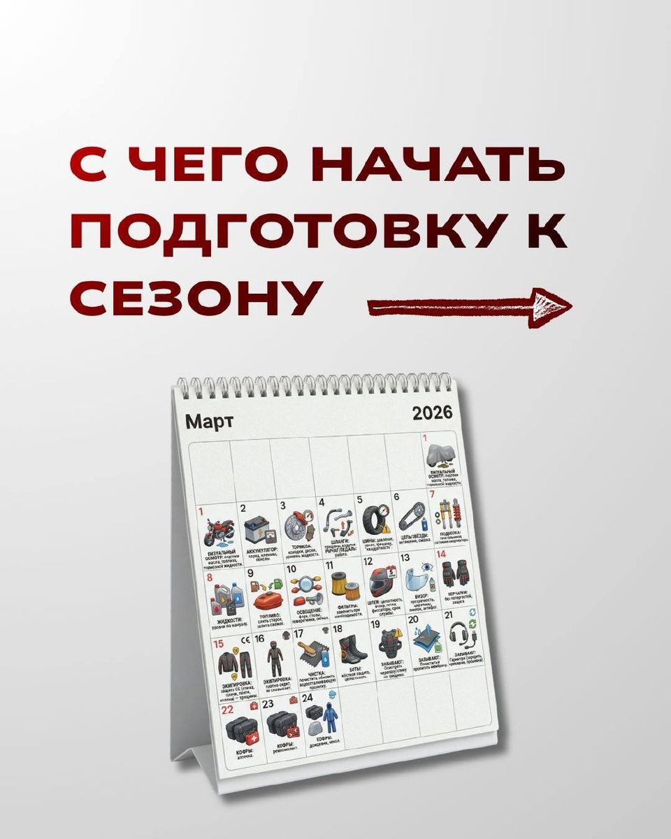 В карусели — полный чек‑лист: что проверить перед первым запуском, какие элементы требуют особого внимания и что райдеры чаще всего упускают после зимы. Осмотр мотоцикла, состояние шлема и защиты, электроника, кофры — всё собрано в одном месте, чтобы выезжать было спокойно и безопасно.❗️ Листайте карусель и начинайте подготовку к сезону: весна уже близко🏞️ Если хотите, чтобы мы помогли с подготовкой техники или экипа — напишите в комментариях “ГОТОВ К СЕЗОНУ”