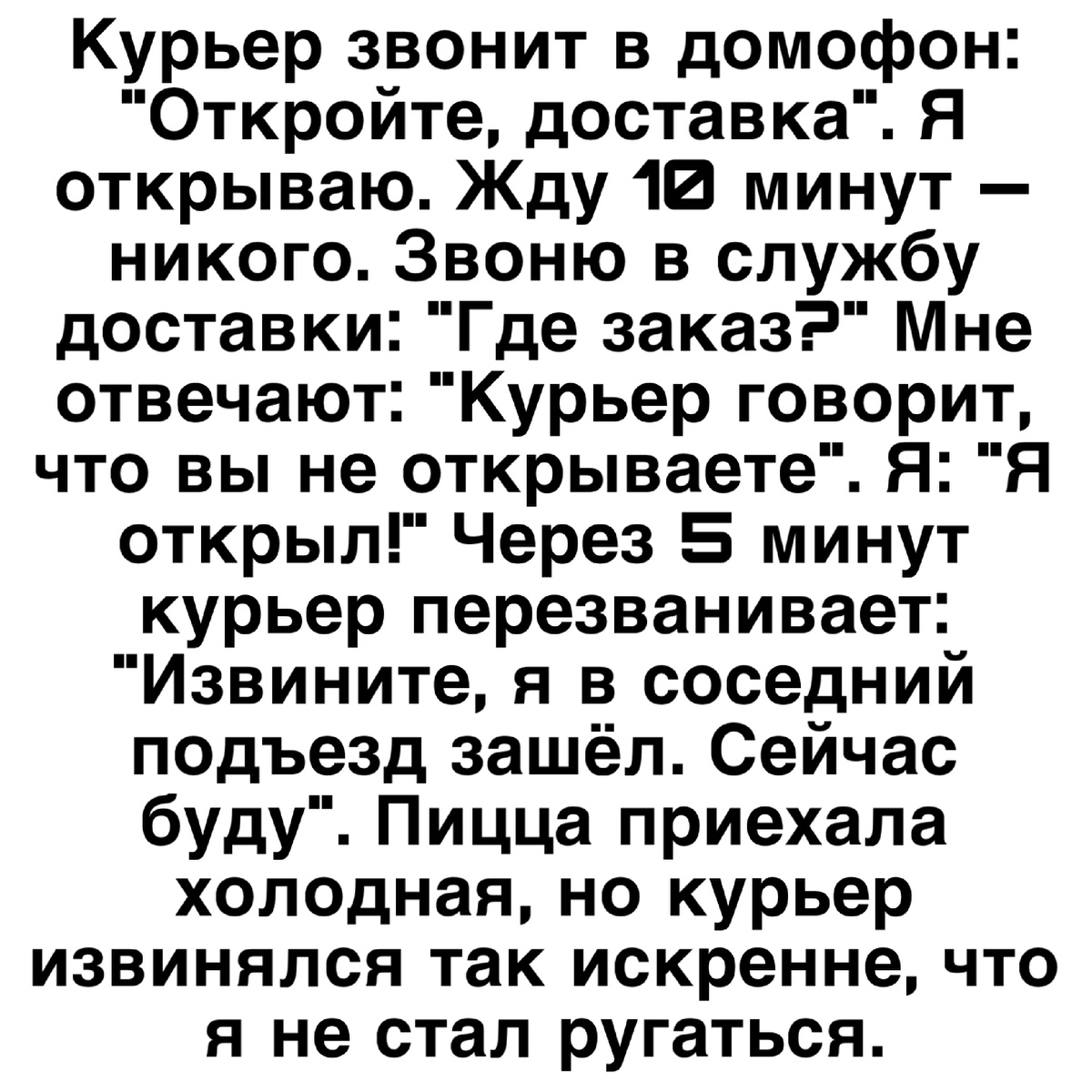 Курьер звонит в домофон: "Откройте, доставка". Я открываю. Жду 10 минут — никого. Звоню в службу доставки: "Где заказ?" Мне отвечают: "Курьер говорит, что вы не открываете". Я: "Я открыл!" Через 5 минут курьер перезванивает: "Извините, я в соседний подъезд зашёл. Сейчас буду". Пицца приехала холодная, но курьер извинялся так искренне, что я не стал ругаться.