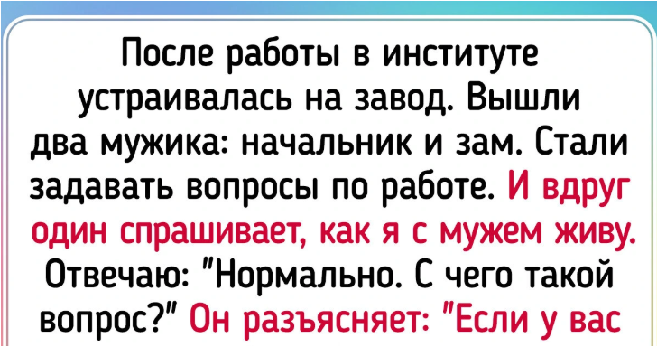 - Проходила собеседование в институте, потом на завод. Два мужика — начальник и зам — задают вопросы, вдруг один спрашивает про мои отношения с мужем. Я отвечаю: «Нормально, а почему?» Он объясняет: «Если семья ладит, значит и работать будете хорошо». Я спрашиваю, что если нет — задержусь? Они поняли, что я не хочу идти, и сделали вывод верно.