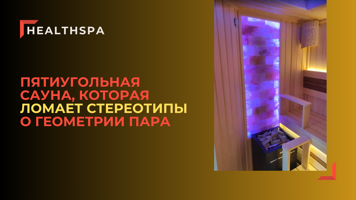 Когда заказчик из Кубинки попросил сделать сауну в форме пятиугольника, мы в HEALTHSPA сначала удивились, а потом приняли вызов. Потому что нестандартная форма требует нестандартных решений. Вот что у нас получилось. Геометрия воздуха. Пятиугольник — это не просто дизайн. Это физика. В такой парной нет «мертвых» зон: жар распределяется мягче и равномернее. Стены и потолок мы зашили вагонкой из липы — классика, которая не обжигает и дарит легкое дыхание природы. Игра контрастов. Лавки из абаши (африканского дуба) мы разбавили вставками из термоабаши. Темные полосы на светлом дереве создают графичный ритм. А на потолке появилось панно из можжевельника с подсветкой — когда свет включен, комната наполняется мягким сиянием и едва уловимым хвойным ароматом. Сердце и стена. Печь — HARVIA VIRTA напольного типа. Строгая, лаконичная, почти скульптурная. А за ней — стена из гималайской соли. С подсветкой, конечно. Три настроения. Мы сделали несколько сценариев освещения: Эта сауна получилась не п