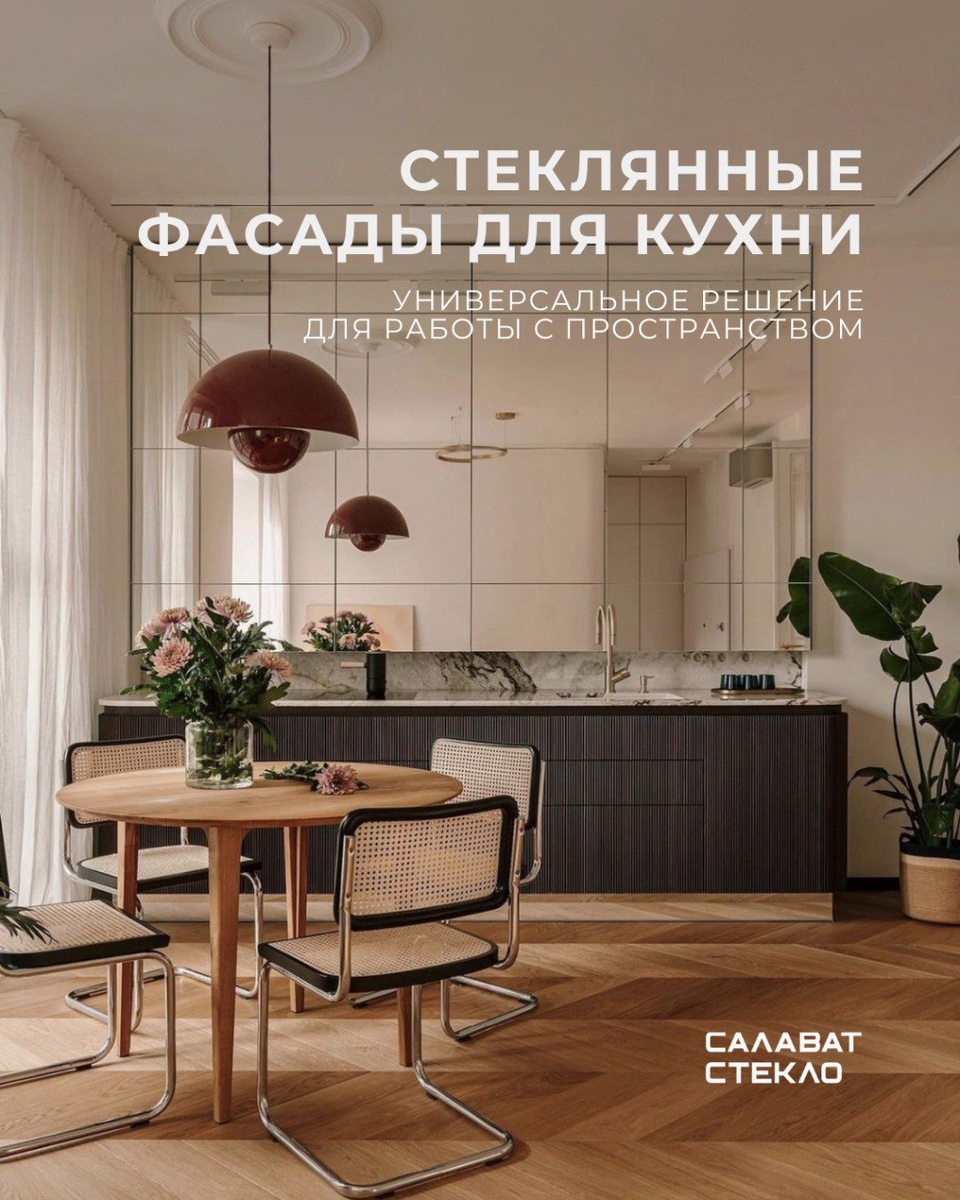 Как создать кухню, которая выглядит легче, чище и дороже? Ответ прост: использовать стекло в кухонных фасадах. Стекло отражает свет, рождает эффект «воздуха» и расширяет возможности интерьера: именно оно позволяет создать уникальный функциональный стиль вне зависимости от ограничений пространства. «Салаватстекло» предлагает несколько продуктов, подходящих для кухонных фасадов. 🧊 Закалённое особо прозрачное стекло Ultraview R Максимально нейтральная прозрачность без характерного зелёного оттенка. Цвет фасада передаётся в точности: если в интерьере помещений есть общий стиль, его будет легко сохранить и на кухне. Закалка повышает прочность в несколько раз и делает стекло безопасным на случай повреждения. 🧊 Стекло, окрашенное в массе Оттенок формируется внутри материала, за счет чего цвет получается глубже, без эффекта цветной «плёнки» сверху. Окрашенное стекло позволяет создавать уникальные атмосферные акценты в интерьере: у кухни теперь есть настроение и свой характер. 🧊 Зеркал