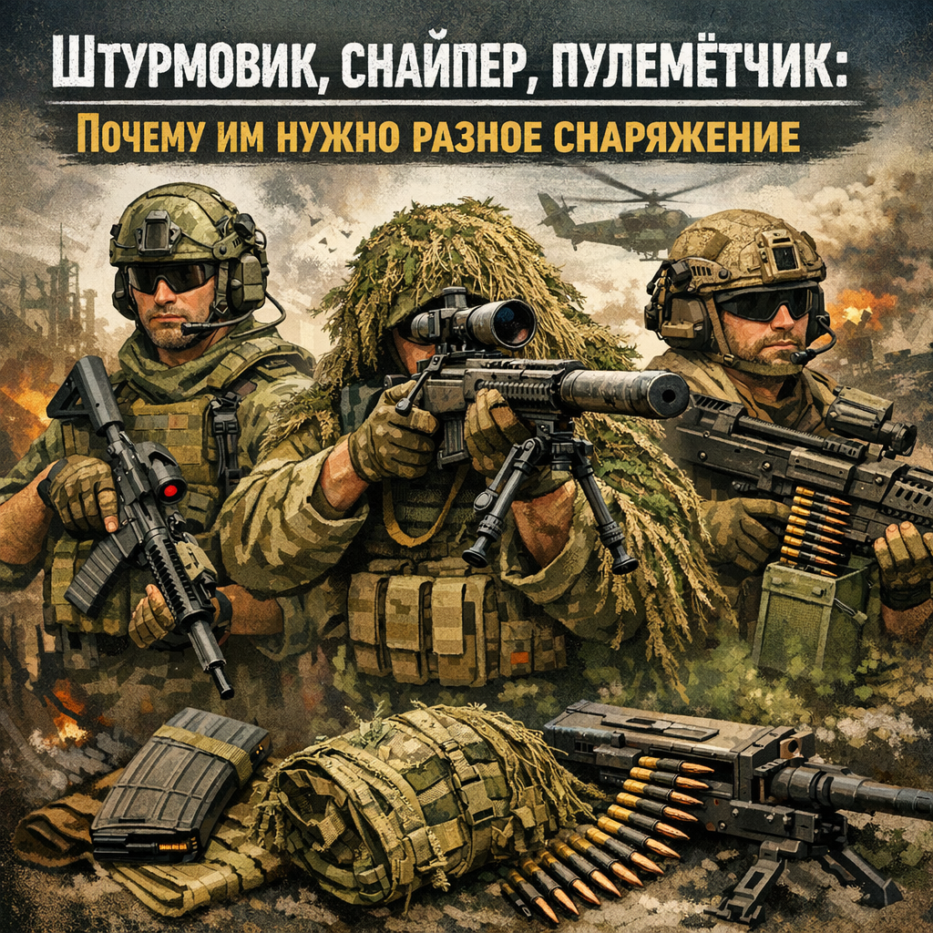 Штурмовик, снайпер, пулемётчик — три разные профессии с разными требованиями к снаряжению. Пытаться собрать один комплект на все случаи — значит получить компромисс, который не работает нигде.