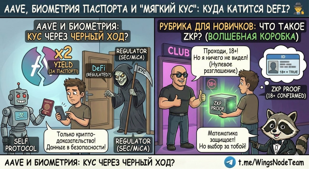 ? Как и обсуждали в прошлом посте, Aave меняет правила игры. Кто-нибудь уже обратил внимание на их свежую интеграцию с протоколом "Self" в сети Celo? ℹ️ Суть кампании: если вы предоставляете ликвидность в USDT или WETH, вы можете получать удвоенную доходность (yield). Но есть условие - нужно доказать свою "человечность" (Proof-of-Humanity). Для этого требуется скачать приложение Self и отсканировать NFC-модулем телефона микрочип в вашем биометрическом загранпаспорте или ID-карте. Это что, KYC через черный ход? ℹ️ Разработчики позиционируют это как защиту от "Сибилл-атак" (когда фермеры создают 1000 кошельков и забирают все бонусы себе). Задумка благая - честные награды реальным людям. Протокол Self гордится своей "privacy-first" архитектурой: смарт-контракт не узнает вашего имени, гражданства или фото. Он получит только криптографическое доказательство: "Да, это уникальный живой человек с легитимным паспортом". Никаких данных на серверах. ℹ️ Но давайте смотреть шире. Сейчас это до