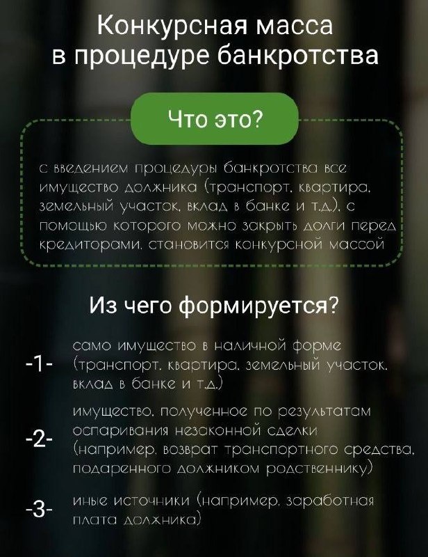 ? 💼 При входе в процедуру банкротства вы обязательно столкнетесь с термином «Конкурсная масса». Звучит официально и немного пугающе, но давайте разберем, что это такое на самом деле. Конкурсная масса — это всё имущество и доходы должника на момент открытия процедуры, из которых будут производиться расчеты с кредиторами. Из чего она формируется? 1. Имущество в наличии: Ваш транспорт, вторая недвижимость (дачи, гаражи), земельные участки и денежные вклады в банках. 2. Возврат через оспаривание сделок: Если вы за последние 3 года «подарили» машину брату или продали дачу за бесценок перед банкротством, финансовый управляющий может оспорить эту сделку. Имущество вернется в конкурсную массу. 3. Текущие доходы: Например, ваша заработная плата. Но не вся! (Об этом ниже). Важно: Формированием и управлением этой массой занимается арбитражный управляющий. Его задача — соблюсти баланс интересов и закон. Что у вас НЕ ЗАБЕРУТ при банкротстве? 🛡 Самый частый страх: «После банкротства я остан