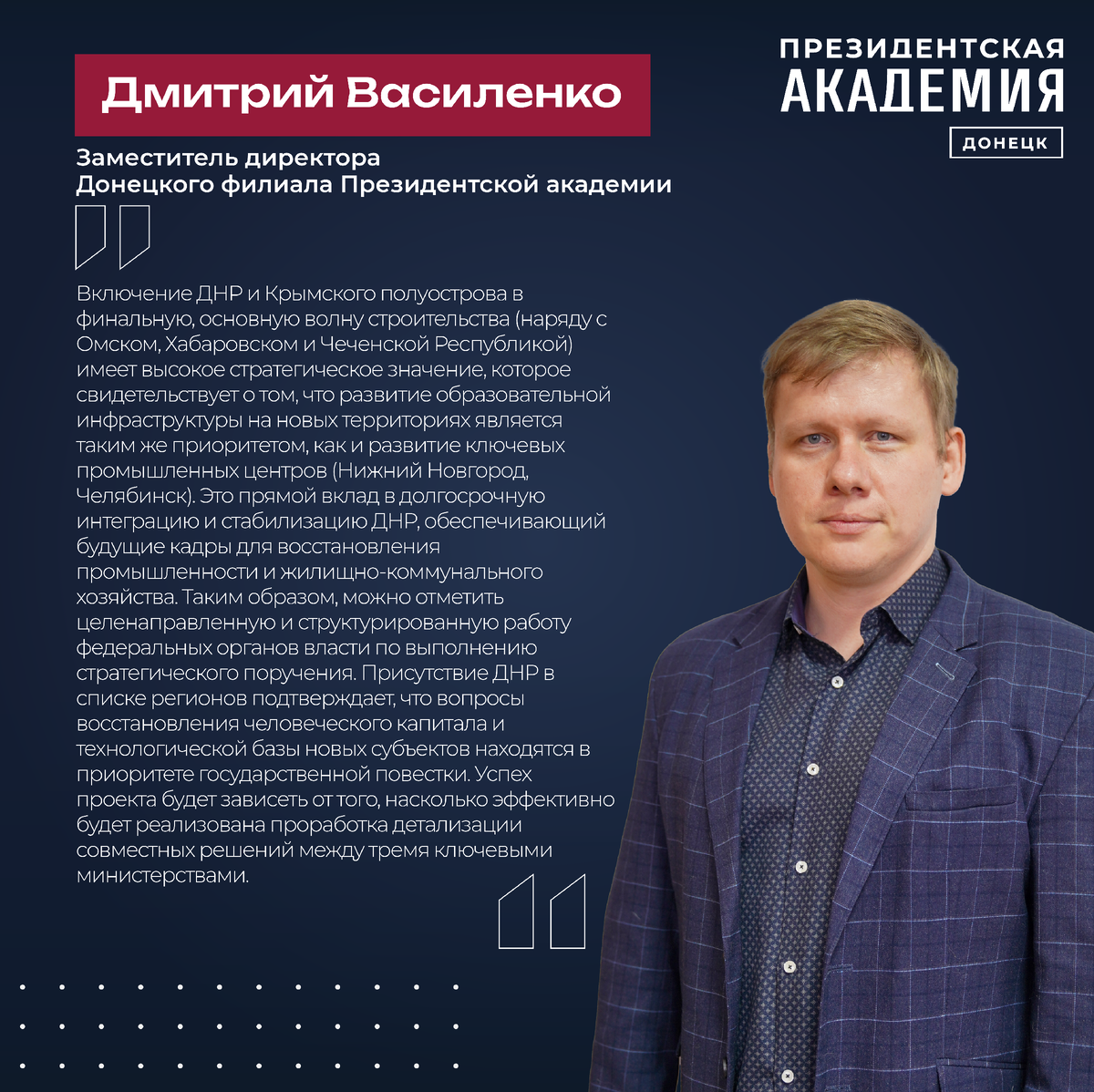 Заместитель директора Донецкого филиала Президентской академии Дмитрий Василенко считает, что «Министр строительства и жилищно-коммунального хозяйства РФ Ирек Файзуллин отметил необходимость разработки и реализации важного управленческого акта, касающегося выполн