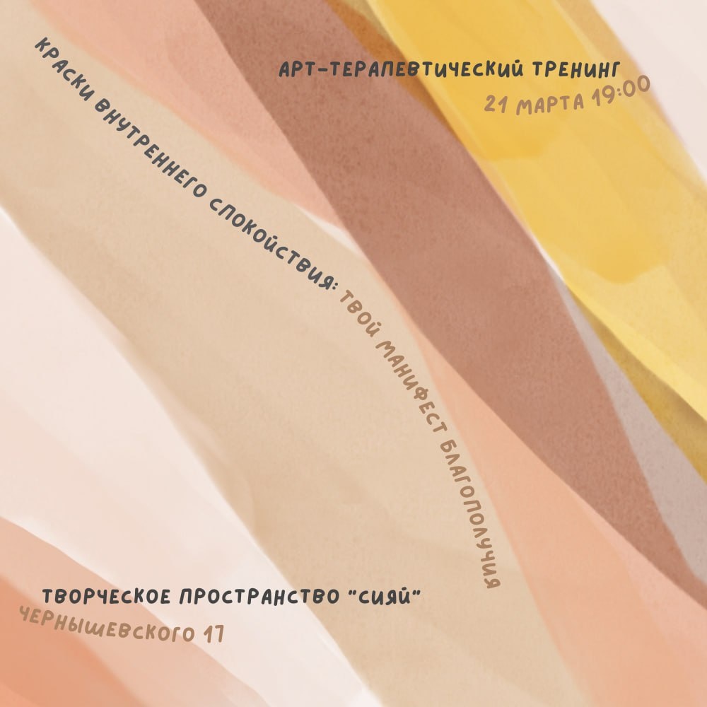 » Бывает ли так, что в суете будней вы теряете связь со своими истинными желаниями и тем светлым, что есть внутри? Я приглашаю вас замедлиться и посвятить время самому главному человеку в вашей жизни - самому себе. На моем арт-терапевтическом тренинге мы не просто будем рисовать. Мы станем исследователями вашего внутреннего мира. Через цвет и линии мы достанем на поверхность те приятные эмоции, которых вам сейчас не хватает: будь то спокойствие, уверенность или детская радость. Особенностью нашей встречи станет создание личной картины-талисмана. Вы дополните свой арт-объект уникальной аффирмацией - фразой, которая будет поддерживать вас и напоминать о вашем ресурсе каждый раз, когда вы взглянете на холст. Вам не нужно уметь рисовать. Важно только ваше желание почувствовать себя лучше и разрешить себе творить. Все материалы уже ждут вас. Давайте вместе создадим образ вашего счастья, который останется с вами не только в памяти, но и на холсте. Записываем дату: 21 марта в 19:00 (все
