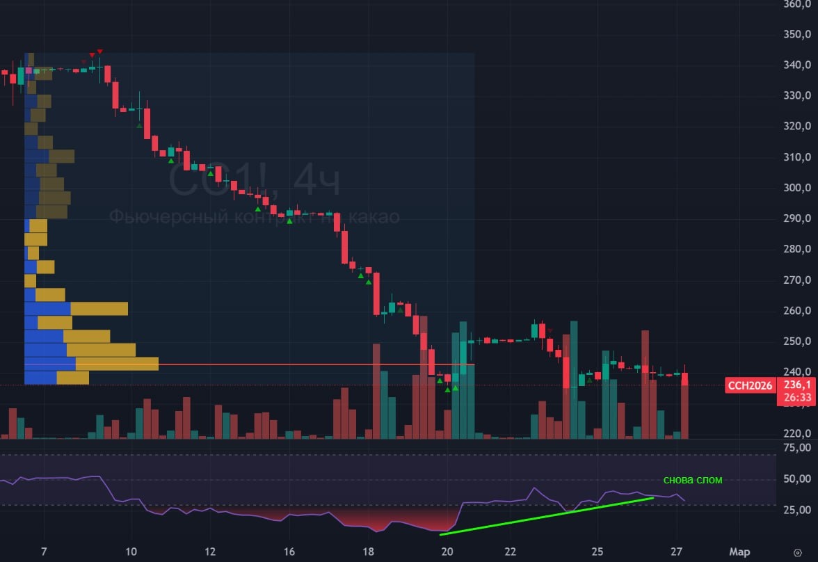 🟢 Снова слом конвергенции. Повышенные объемы не привели к проявлению бычьей силы. Цену ушла на перелой последних дней. 🚗 Нужно ждать разворотную свечку, пока ее нет. А перспективные формации в итоге ломаются. Тем не менее пока лонг держу, надо посмотреть как американцы сегодня закроют день по какао. #какао #cc1 #cocoa #bogdanoffinvest $CCH6 $CCJ6