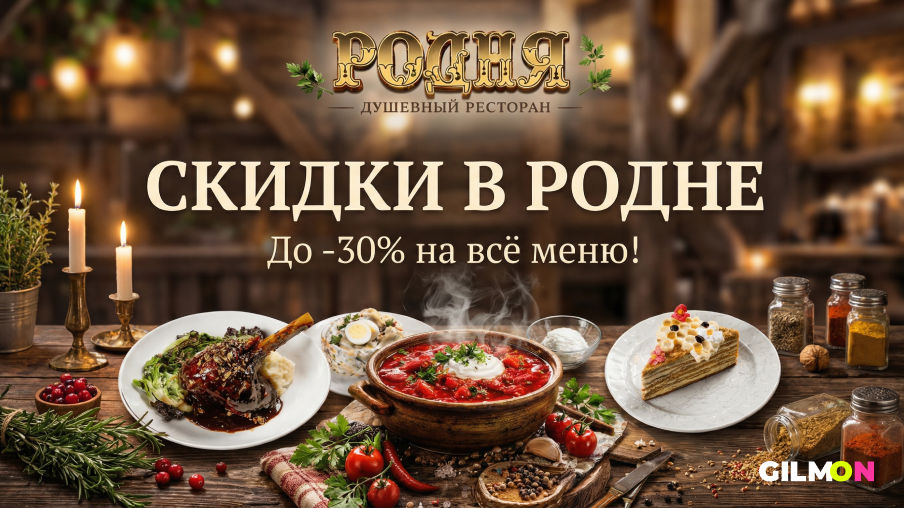 🍽 в зале и навынос Это хороший повод познакомиться с кухней ресторана или вернуться за любимыми блюдами — ужин становится заметно выгоднее. Помимо юбилейной акции действует ещё более выгодное предложение. На платформе GILMON доступна специальная скидка 30% на всё меню кухни. Условия простые: Это возможность попробовать блюда ресторана с максимальной выгодой. За 10 лет ресторан стал местом постоянных встреч для многих жителей города. Секрет прост — стабильное качество кухни, внимание к гостям и атмосфера, в которой одинаково комфортно и на семе