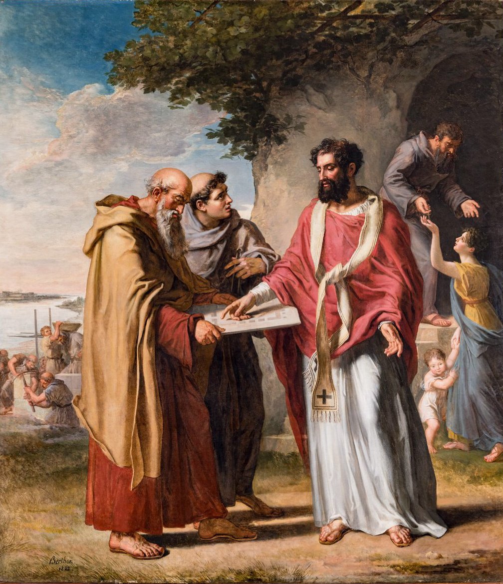 Французский художник Рене Теодор Бертон (1776–1859) изучал принципы неоклассической живописи под руководством Жака-Луи Давида (1748–1825): его работы отличаются ясной и элегантной композицией, мощными, возвышенными жестами, приглушенной палитрой и точным исполнением. Помимо того, что он был успешным портретистом, он также писал исторические, мифологические и библейские сюжеты и пользовался большим спросом как в наполеоновскую эпоху, так и в период Реставрации. Несомненно, именно благодаря своему происхождению из Тура Бертону было поручено написать картину на редкий для живописи сюжет, взятый из жизни святого Мартина. Родившийся в 372 году в Саварии (ныне Сомбатхей, Венгрия), святой основал аббатство Мармутье, один из старейших монастырей Франции, недалеко от города Тур. На этой масштабной картине, показанной в Парижском салоне в 1822 году, Мартин изображен не в епископских облачениях, а в простой классической одежде: он рассматривает планы нового здания, в то время как на заднем пла