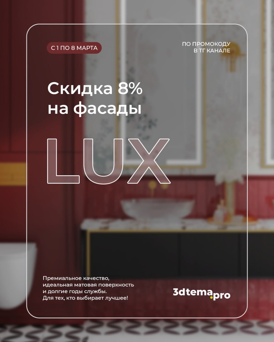 🌷 Зима заканчивается, весна начинается — а вместе с ней и новые специальные условия для подписчиков нашего канала. Создавайте крутые интерьеры с фасадами LUX и выгодой до 8 марта! Премиальное качество, идеальная матовая поверхность и долгие годы службы. Для тех, кто выбирает лучшее! Условия: скидка 8% на все фасады из коллекции «LUX» в матовой эмали; Промокод: Тюльпан Срок действия: с 1 по 8 марта 2026 г. 👉 КАТАЛОГ ФАСАДОВ LUX ❓ Как получить скидку? 1. Вы — подписчик нашего канала (это уже так!); 2. Выбираете фасады в нашем каталоге; 3. Называете нужный промокод менеджеру при оформлении заказа. Предложение действует с 1 по 8 марта 2026 года. Обсудить проект и получить расчёт: 📱 @tema3d_imr 📩 info@3dtema.ru