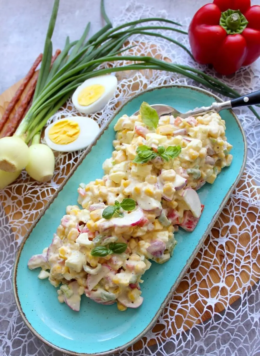 Яркие, сочные, красивые и при этом они сытные, не смотря на весенний свежий порыв и уже явное желание начать худеть. Собрали для вас свои самые интересные салатики к праздничному столу. - 2 вареных яйца кубиками - 4 редиски полукружочками - маленькая баночка консервированной кукурузы - 4-5 тонких острых колбасок мелкими кусочками - половинка красного болгарского перца кубиками - зеленый лук - майонез - соль и перец по вкусу 200 гр. ветчины или свиного окорока 100 гр. твердого сыра 2 вареных яйца репчатый лук (маленькая луковка) маленькая баночка консервированной кукурузы красный болгарский перец майонез 2 зубчика чеснока соль перец Нарежьте сыр, яйца, перец и ветчину кубиками. Лук нарезайте тонкими полукольцами. Чеснок натрите на терке. Смешайте майонез с измельченным чесноком, солью и перцем. Выложите все ингредиенты в миску, добавьте приготовленный соус и перемешайте. 200 гр. отварного рыбного филе 3 вареных яйца баночка консервированной кукурузы 50 гр. тертого твердого сыра репчаты