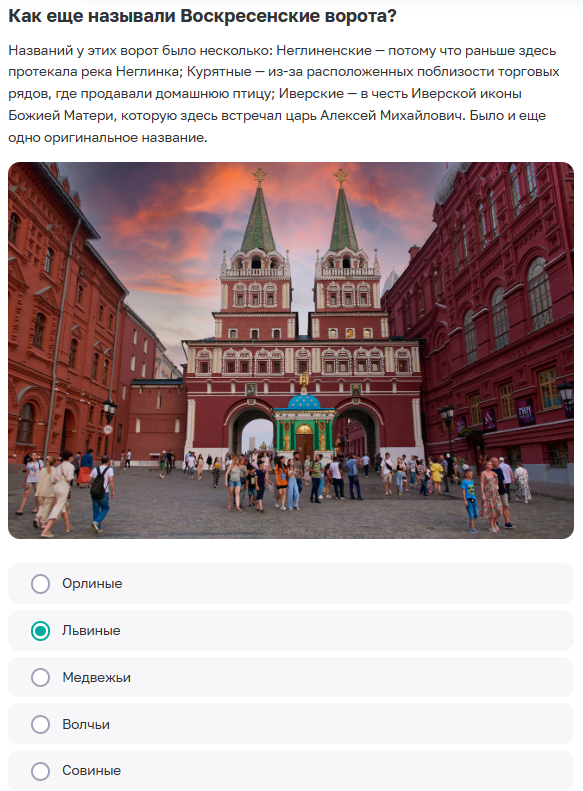 Сама викторина. "Активный гражданин" начисляет 40 баллов за указание правильных ответов викторины. Название «Львиные» ворота получили не случайно. При царе Алексее Михайловиче у Никольского моста через ров у ворот стояли фигуры львов (по другим данным, львов держали в специальном рву у ворот как экзотических животных). Церковь Вознесения, открывающаяся взгляду, первый каменный шатровый храм на Руси, построенный в 1532 году в честь рождения будущего царя Ивана Грозного. ЮНЕСКО внесло её в список Всемирного наследия. Высота фигур тракториста и колхозницы — 8,5 метров, а общий вес скульптуры около 6 тонн. Интересно, что это не цельная отливка, а сборная конструкция из 180 бетонных блоков. Скульптуры бегущих оленей на пилонах ворот — редкий образец садово-парковой скульптуры из шпиатра (сплав цинка с алюминием и медью). Их вернули на историческое место в ноябре 2025 года после сложной реставрации. Примечательно, что именно через эти ворота въезжал поручик Ржевский в фильме «Гусар