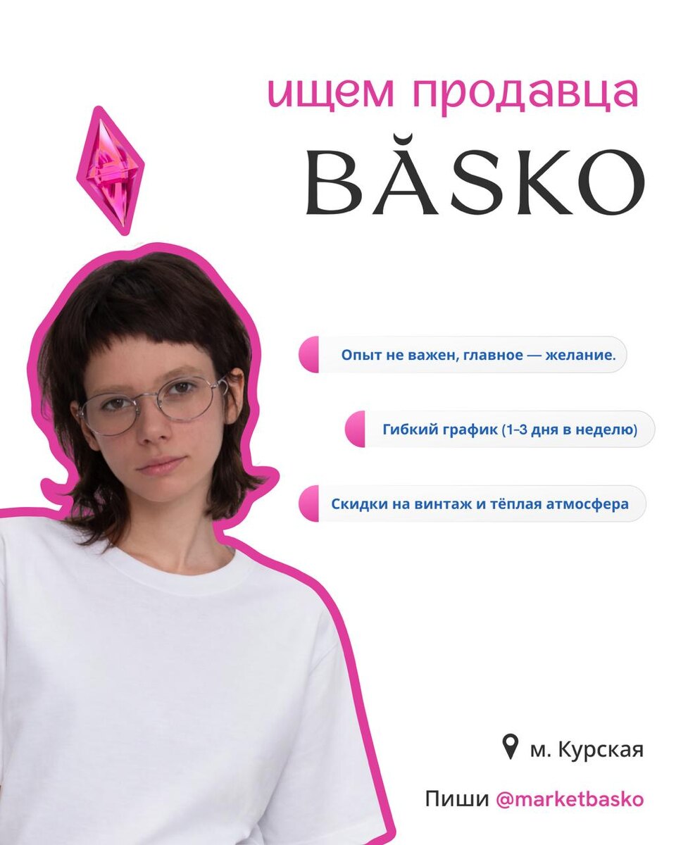 🩷 Винтажный магазин на Курской приглашает в команду: — внимательного и общительного — с любовью к моде и винтажу — ответственного и пунктуального 🤩Опыт не важен, главное — желание 🤩Гибкий график (1–3 дня в неделю) 🤩Скидки на винтаж и тёплая атмосфера 🤩 м. Курская Пиши @marketbasko 💫