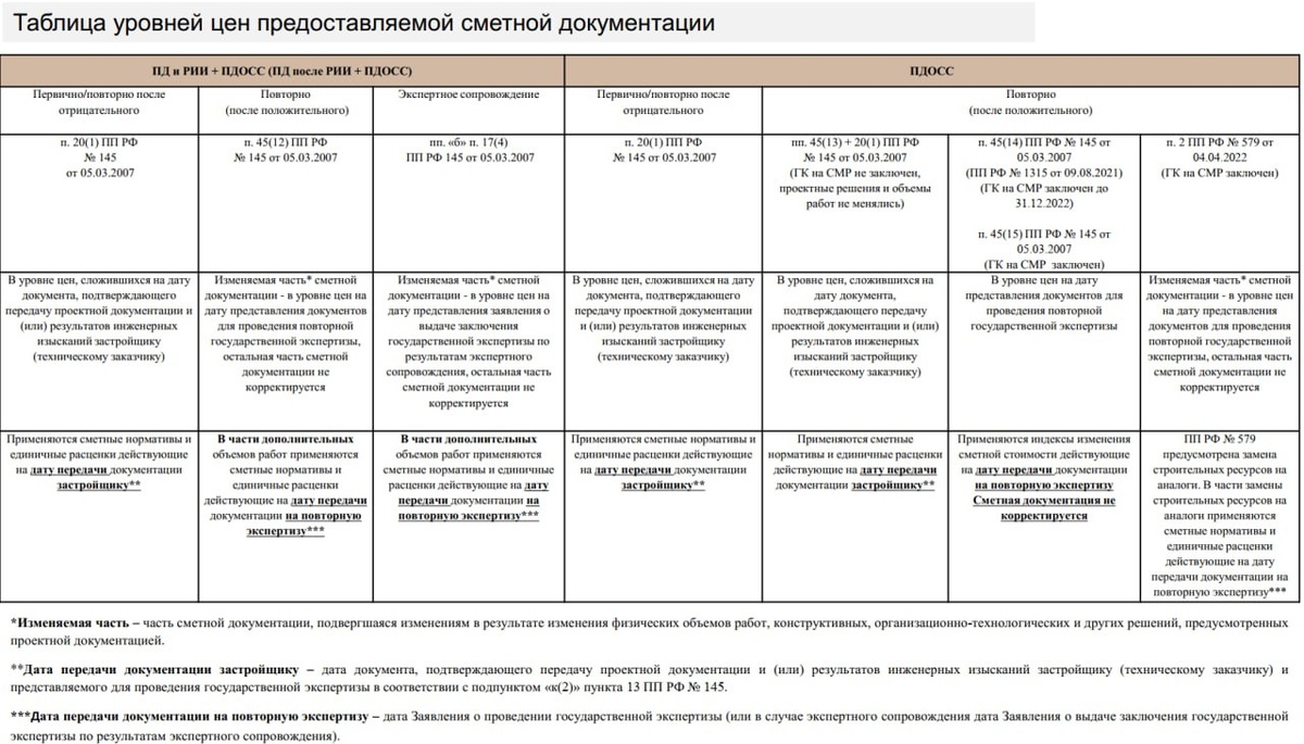 📀 Скачать сводную таблицу по уровням цен, в которых представляется сметная документация на экспертизу 🆕 При первичном представлении сметной документации на экспертизу (повторном после получения отрицательного заключения) уровень цен принимается на дату её передачи заказчику - п.20(1) ПП РФ №145 ↩️ При повторном представлении сметной документации на экспертизу (после получения положительного заключения) уровень цен принимается на дату передачи документов в экспертизу для проведения повторной оценки в части, подвергшейся изменениям, при этом остальная часть сметной документации не корректируется - п.45(12) ПП РФ №145 🔄 На повторную экспертизу документация может направляться 2 раза и более - п.44 ПП РФ №145 ⚙️ Экспертной оценке при проведении повторной экспертизы подлежит в том числе совместимость внесенных изменений с ПД, в отношении которой была ранее проведена экспертиза - п.45 ПП РФ №145 ℹ️ Пересчет индексным методом выполняется по письмам Минстроя России и Госстроя, включенны