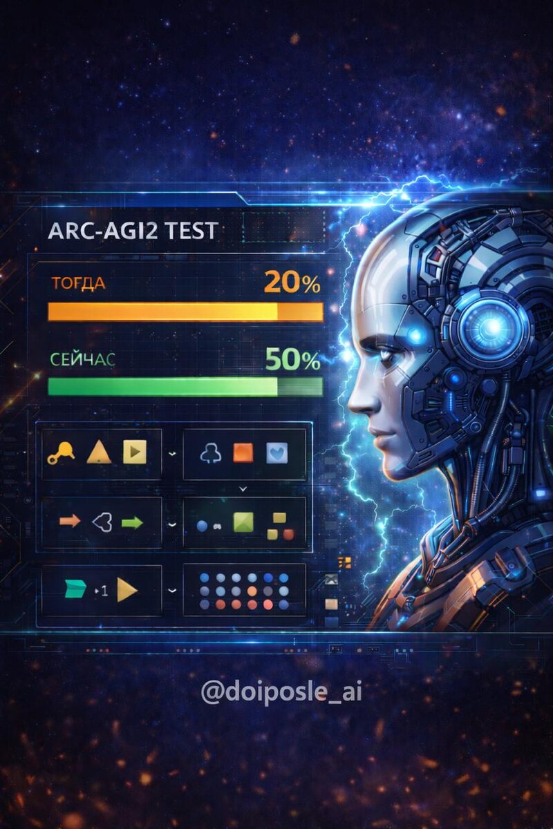 🧠 Февраль 2026 - ИИ достиг 50% на ARC-AGI2, тесте абстрактного мышления. Ещё недавно - 20%. Рост экспоненциальный. ⚡ ДО: ИИ проваливается на абстрактных паттернах. ARC-AGI2 тестирует творческое мышление. ⚡ ПОСЛЕ: 50% - порог человеческого мышления. Карим Бегуир: AGI станет реальностью к концу 2026. Критерий - работа на уровне эксперта. Уже может. Изменения: прорывы в энергии, биотехе, лечении рака. ИИ понимает контекст без сложных промптов. #AGI #ARCAGI2 #ДоИПосле