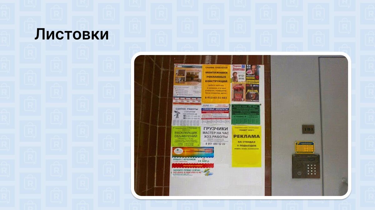 Старо, как мир. Эффективно среди старших слоев населения. Преимущества работы с площадкой 👍 Точное таргетирование: можно расклеивать в нужных районах 👍 Не очень дорого 👍 Заявки могут приходить даже через месяцы 👍 Минимум спама Недостатки работы с площадкой 👎 Без фотоотчета в 3 раза дороже, иначе не расклеят качественно 👎 Легко сорвать листовки 👎 Нет доступа в премиальные/закрытые ЖК: заборы, отсутствие досок объявлений 👎 Качество расклейщиков низкое из-за низкой стоимости оплаты труда 👎 Не масштабируется быстро Итог по площадке Может хорошо отрабатывать, но в последнее время у людей все меньше доверия к подобной рекламе. Возможно, более оригинальные заходы смогут подправить ситуацию в вашем случае. 🟢🟢 Легкость самостоятельного старта 🟢🟢 Возможность конкурировать 🟡🟡 Цена/качество заявки 🟠🟠 Объём целевого трафика