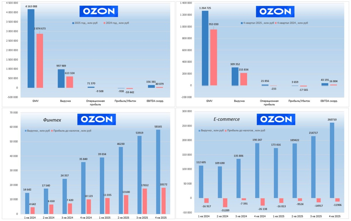 🛍 И вот уже стабильная прибыль - 3ий квартал подряд 👍 Но за год всё равно убыток 😁 ▫️OZON выпустил третий прибыльный отчёт(как и ожидалось). ▫️Заплатят дивиденды на 30 млрд в 2026 году, вероятно двумя платежами. В пересчёте на акцию это рост на 20% или около 173 рублей. ▫️СД Ozon утвердил дебютную программу биржевых облигаций на 100 млрд рублей со сроком до 30 лет. ♥️В 4 квартале оборот GMV год к году вырос на 33% , %-ный рост худший в 2025 году. Оборот OZON это можно сказать выручка продавцов на OZON , сам же OZON учитывает выручку как комиссии, собственные продажи, реклама и т.п. ♥️ Выручка выросла на 43% , при этом компания заработала операционную прибыль 21,8 млрд , результат лучший за год. Любая компания должна работать в операционную положительную прибыль, иначе не понятно, чем вообще она занимается. За год картинка сильно изменилась 73 млрд, против 10 млрд операционных убытков в 2024ом. ♥️ Прибыль выросла до 3,6 млрд , с 2,9 млрд в прошлом квартале и убытков год наз