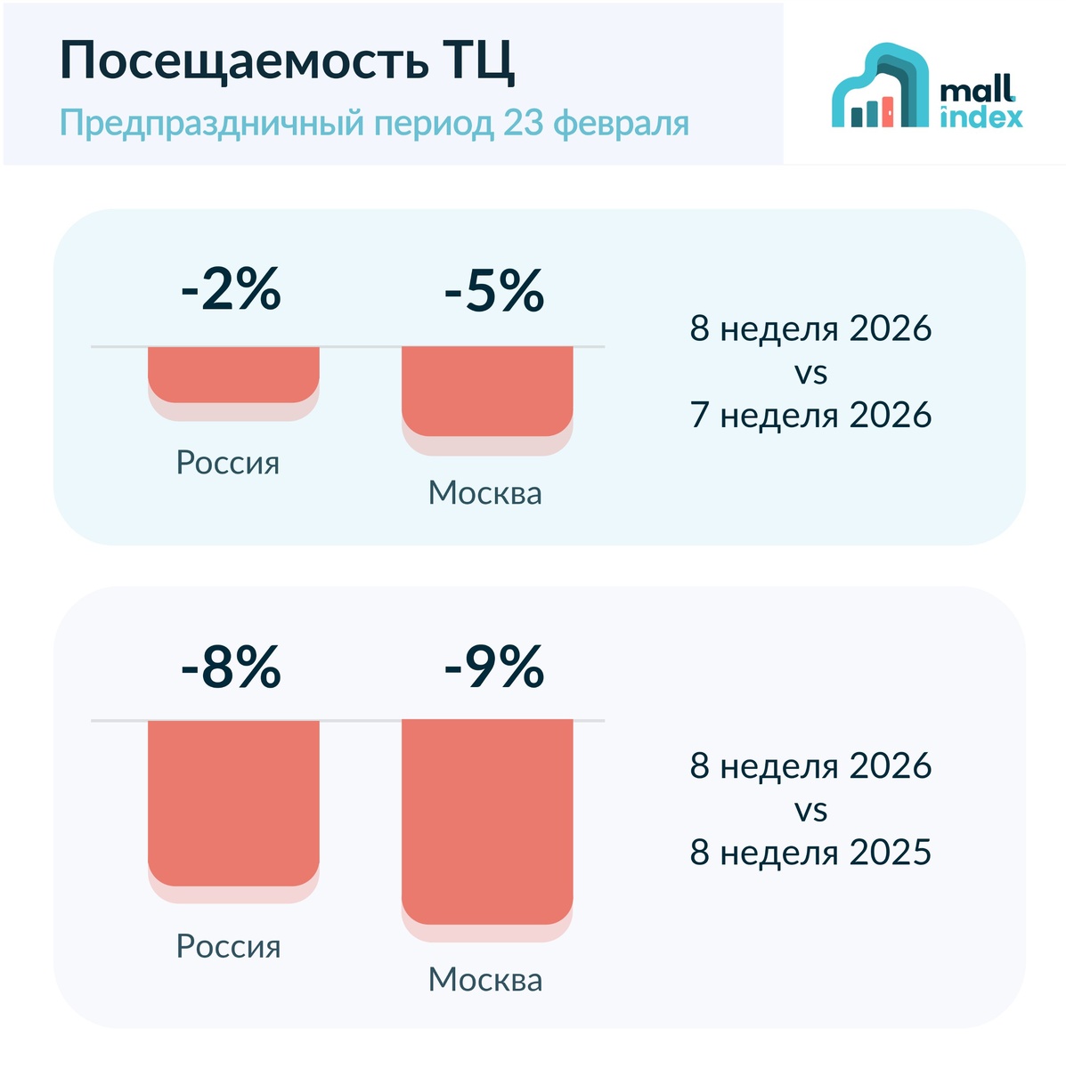 🔻 8 неделя 2026 vs 7 неделя 2026 года −2% Россия −5% Москва 🔻 8 неделя 2026 vs 8 неделя 2025 года −8% Россия −9% Москва «Ситуация ухудшилась во второй половине недели, особенно в Москве, где дополнительным фактором снижения посещаемости стали снегопады», — Михаил Васильев, Focus Technologies.