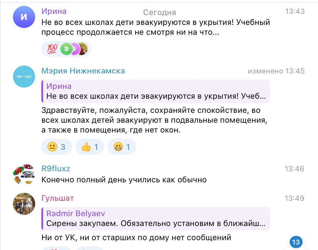 27 февраля в Татарстане впервые ввели режим «Ракетной опасности». Радмир Беляев обратился к нижнекамцам с просьбой сохранять спокойствие, сообщил, что ситуация под контролем. В Нижнекамске слышны звуки сирен, подъезды, которые оснащены системой «Умный дом» открыты для обеспечения доступа, детей во всех школах эвакуировали в укрытия под присмотром педагогов и служб безопасности. Общественный транспорт пока приостановил движение. Аэропорты закрыты. Однако, несмотря на сообщение мэра, читатели его телеграм-канала пишут, что не во всех школах была эвакуация: Фото: Скриншот комментариев под постом в телеграм-канале Радмира Беляева МЧС рекомендует: Ранее мы писали о том, как Альметьевск пережил атаку дронов в праздничный день.