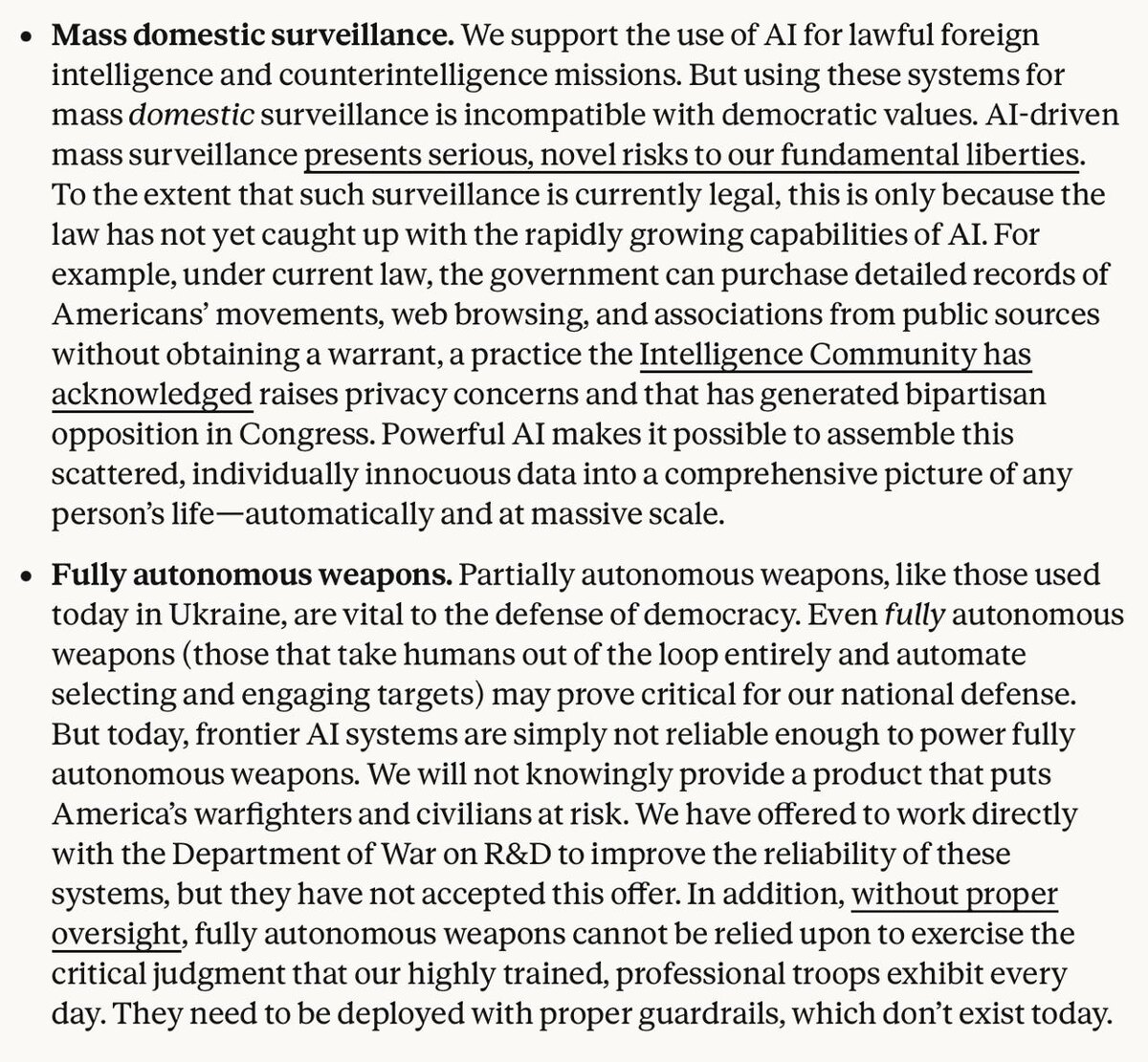 : Цитаты компании: 1. Мы против того, чтобы следить за американцами, за остальным миром двумя руками за (и уже следим) 2. Мы против того, чтобы делать полностью автономных дронов убийц, потому что модели пока ещё не достаточно хорошие. Предлагали Пентагону поработать над этим, но они отказались :( Хорошее заявление, всё проясняет…. То есть уже юзают в военке, просто секретики другим не рассказывают 😂 Блин, ну реально похоже на детское оправдание…
