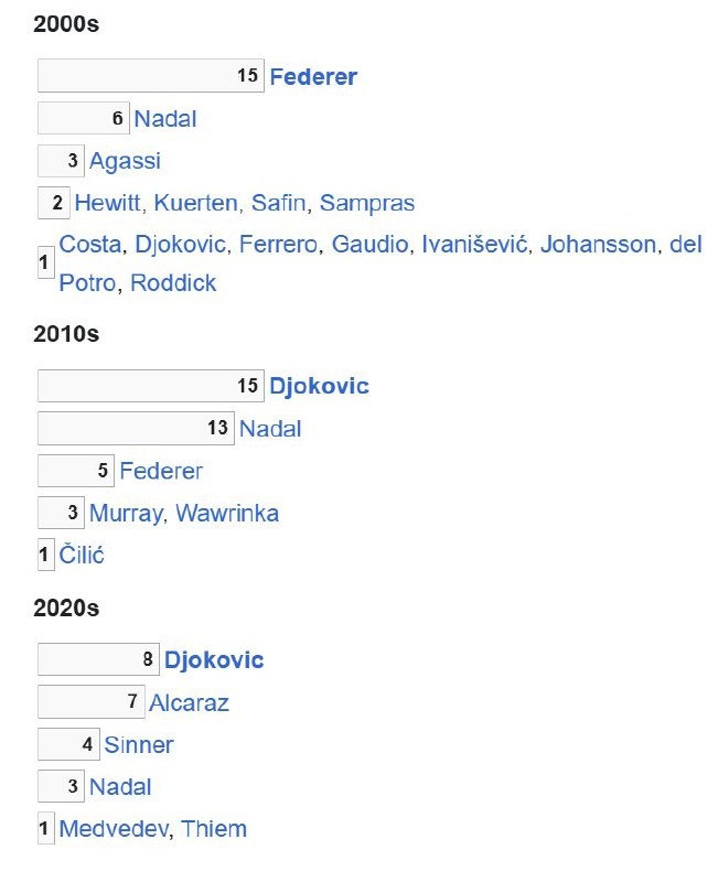 🎾 "Только благодаря упорству можно оставаться чемпионом на протяжении трех десятилетий" Количество побед на турнирах Большого шлема по десятилетиям: 2000-е: Федерер - 15 Надаль - 6 Агасси - 3 Хьюитт, Куэртен, Сафин, Сампрас, Джокович, Ферреро, Гаудио, Йоханссон, Дель Потро, Роддик - 2 2010-е: Джокович - 15 Надаль - 13 Федерер - 5 Маррей, Вавринка - 3 2020-е: Джокович - 8 Алькарас - 3 Синнер - 4 Надаль - 3 Медведев, Тим - 1 Подпишись на Эйс и точка