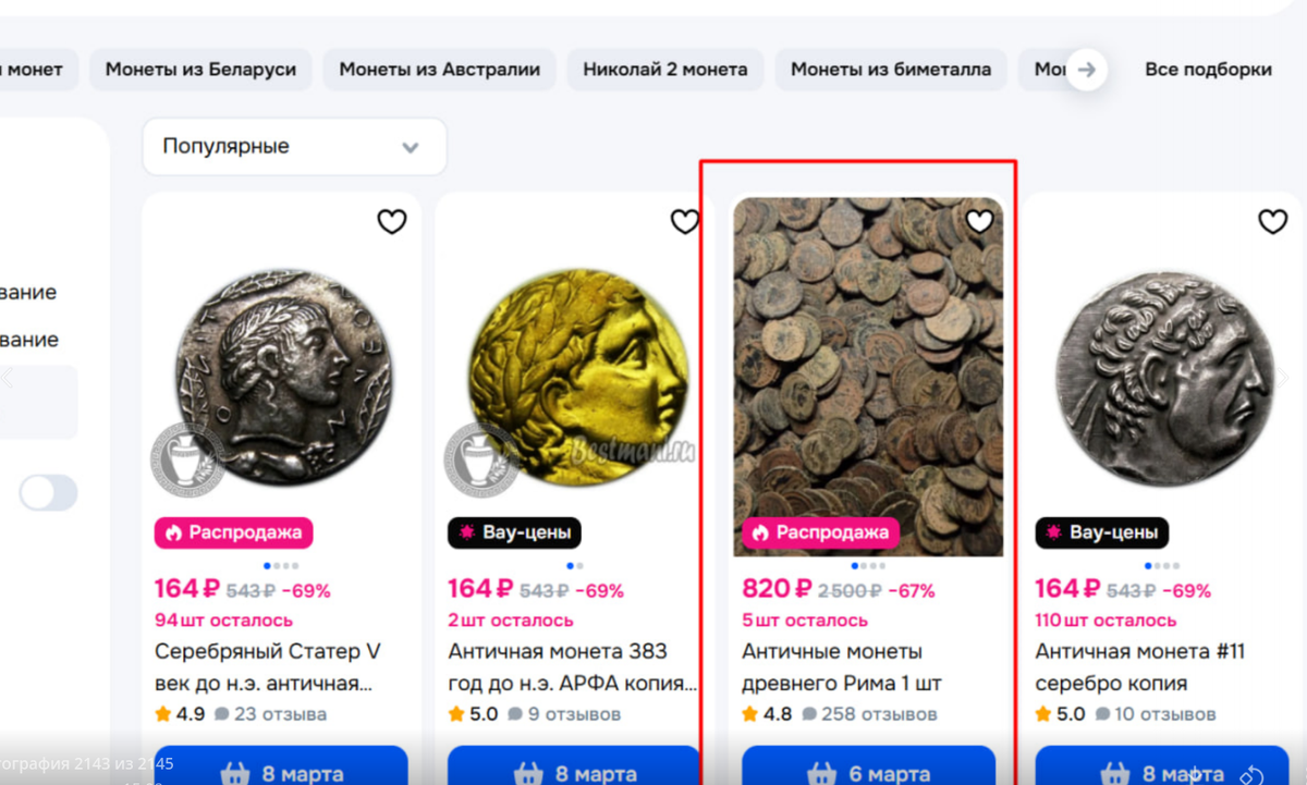 А теперь о ценах. Лот продаётся по 820 рублей за штуку. Дорого это или нет? Вроде монеты и настояще же. И древние. Приехали в Россию как-то. Не могут же стоить копейки, правда? Открою вам секрет, как человек в теме. Подобного качества монеты продаются на опте по 180-220 рублей! Это если вы заказали сразу тысячу штук, например. Как и сделал, я уверен, данный продавец. А продаёт их по 820! Да, что-то забирает себе площадка. Да, надо упаковать. Еще и евроценты кладут какие-то "в подарок", цена которым 2-3 рубля. Но что-то мне кажется, что маржа все-равно выходит раз в пять от закупки, а то и более! А самое главное - большинство покупателей довольны, а значит все всё правильно делают. Но! Давайте подумаем, кто же эти довольные покупатели? Нумизматы ли они? Вполне. Хотя много там и домохозяек, которые берут монетку в подарок сыну или внуку. Обманывают ли их? Нет! А весь секрет в том, что покупатели эти - не коллекционеры именно античных монет! А просто любопытствующие люди. Именно поэтому они довольны даже от очень замусоленной монетки, цена которой 200 рублей.