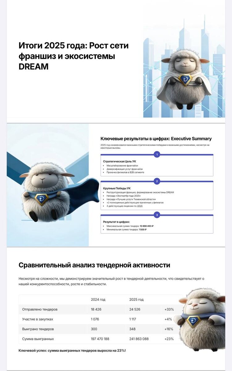 Сегодня хочу поделиться результатами, которые мы сделали для партнёров нашей франчайзинговой сети. Сначала динамика 2024–2025. 📌 Отправлено тендеров: 2024 — 18 426 2025 — 24 526 Рост +33% 📌 Участие в закупках — прирост около 4%. 📌 Выиграно тендеров: было 300 → стало 348 Рост +16% 📌 В деньгах — рост +23%. Важно: мы говорим только о тендерах, которые были выиграны для филиалов франшизы. Не о тендерах управляющей компании. Не о Тюменской группе. Не о совместных предприятиях. Именно о результатах партнёров. Теперь про сеть. За период было открыто: DreamClean — 19 филиалов DES — 4 AIR — 3 Итого — 26 филиалов. Закрыто — всего 3 (по одному в каждом направлении). 3 филиала перешли на формат 2+. Сейчас у нас единая экосистема под общим брендом. Направления: Clean, DES, AIR, Строй. В 2026 запускаем новое направление — ремонт. На текущий момент в этом году уже выиграно тендеров на 34 286 000 ₽. Пока я пишу этот пост — сумма уже превысила 40 млн ₽. Что дальше? В ближайшие 5 лет: — усиливаем ди