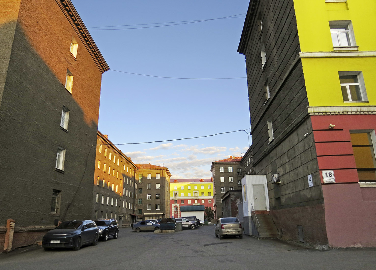 В большинстве дворов Норильска не растёт даже трава. Они закатаны в асфальт от края до края, ведь единственная альтернатива этому асфальту - голая раскисшая земля: если климат здешний выдерживают даже тоненькие лиственницы, то вот комбо из климата и экологии - уже нет. К тому же ровную поверхность проще чистить от снега - а делать это надо очень быстро: если намело несколько метров (что случается регулярно), нижние слои быстро слёживаются в фирн, твёрдый примерно как пенобетон. Весь асфальт - в следах зубастых ковшей грейдеров... А узкие щели между домами напоминают, что тут ещё и лютые ветра. И каждый район строился так, чтобы закручивать их и гасить встречные порывы друг о друга. Заглянув в вентиляционные окошки характерных "юбок" ниже первых этажей - видишь сваи. Ведь мерзлота хоть и вечная, да только её верхние метры вполне себе тают от летней жары или тепла дома. В первую же зиму на 1936 год "Норильлаг" лишился электролизного цеха и нескольких бараков, под которыми буквально попл