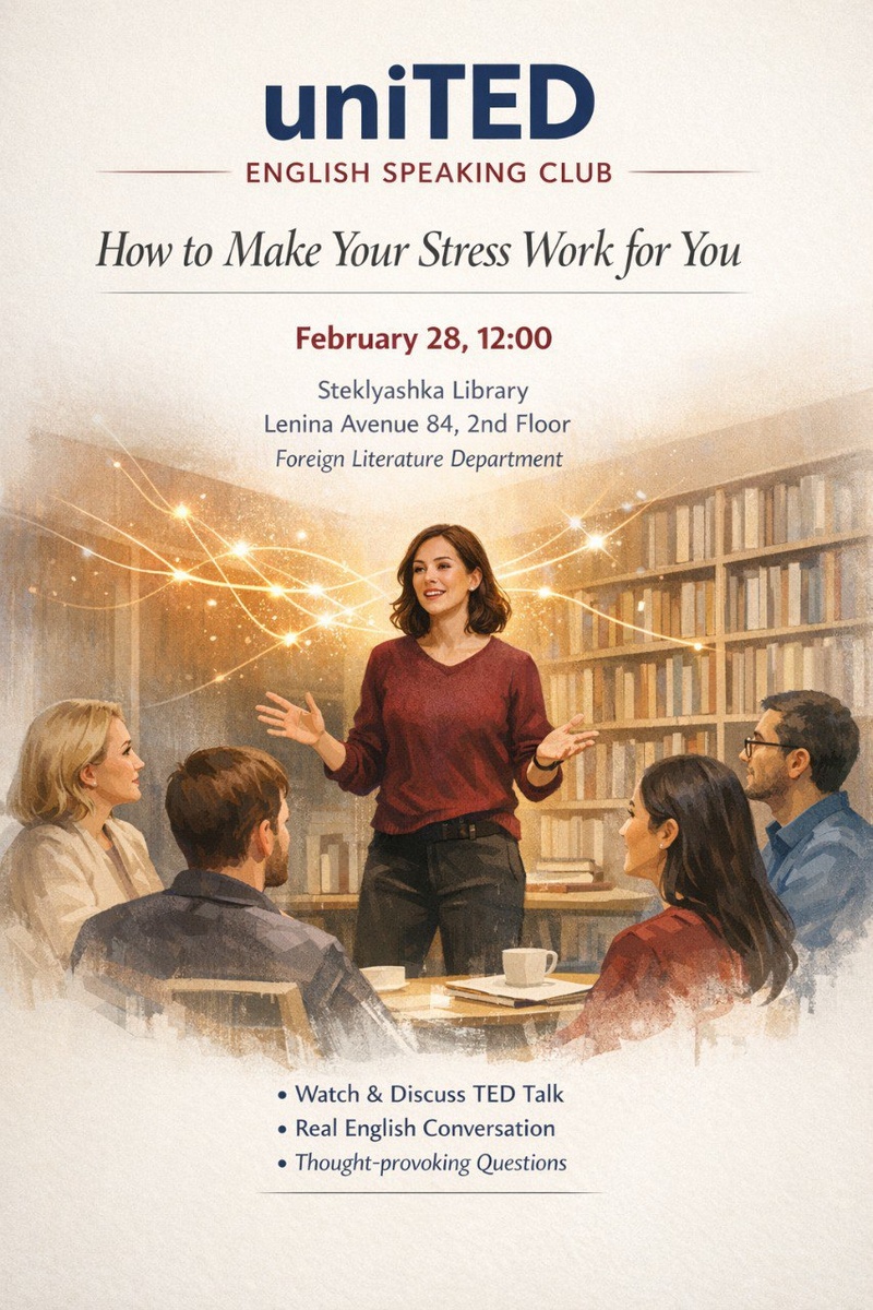 📅 28 февраля (уже завтра!) 🕛 12:00 📍 Библиотека «Стекляшка» пр. Ленина, 84, 2 этаж, отдел иностранной литературы Донейш (по желанию) приветствуется Тема встречи — стресс. Но не в формате «как его избежать», а честно и по-взрослому: как заставить стресс работать на себя. Смотрим и обсуждаем выступление Shannon Odell — “How to Make Your Stress Work for You” (TED) 🎥 YouTube: https://www.youtube.com/watch?v=awhOrqGb-TU 🎥 TED: https://www.ted.com/talks/shannon_odell_how_to_make_your_stress_work_for_you Поговорим: — Почему стресс — это не враг — Как мозг реагирует на давление — Можно ли превратить тревогу в ресурс — Что с этим делать в реальной жизни (работа, дети, проекты, дедлайны…) Формат встречи: • просмотр ключевых фрагментов • обсуждение • свободный разговор на английском • новые слова и новые идеи Если стресс у вас есть — отлично, будет материал для практики 😉 Если нет — приходите, потренируемся заранее. До встречи в «Стекляшке». 👍 Подписаться | Ваша реклама