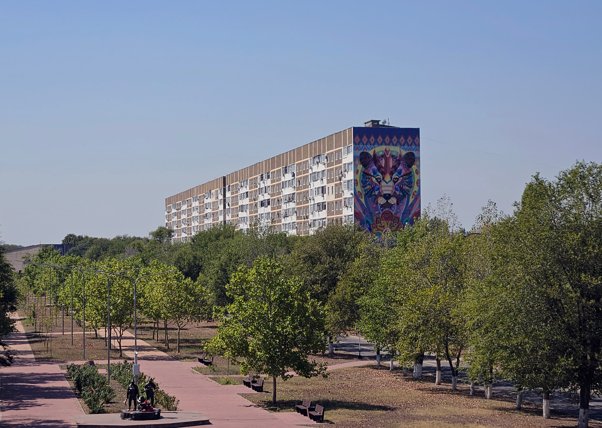 Вдоль набережной протянулись многоподъездные панельные дома, между которыми возвышаются 9-тиэтажные башенки, торцы которых с обоих сторон украшены яркими муралами.