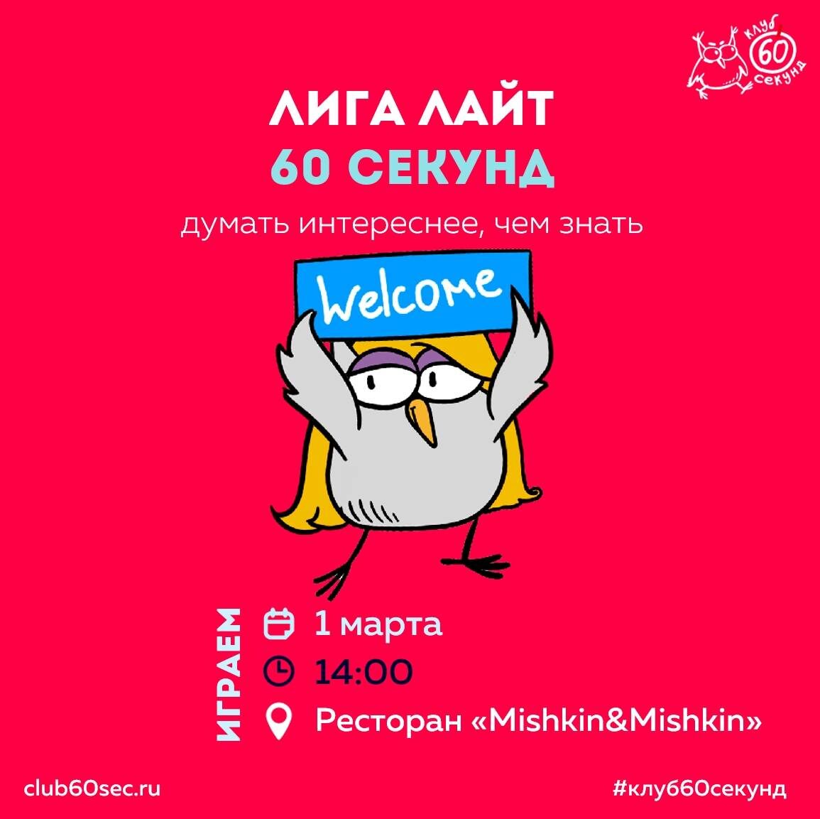 Классический квиз обо всём на свете в уютном лайтовом формате без давления. Идеально для новичков и команд, ценящих удовольствие от игры. Начало: 01 марта 2026 14:00 Стоимость: Бесплатно Адрес: г Омск, ул Кемеровская, д 1/2 Организатор: https://vk.com/public186204342 Лига ЛАЙТ #35 Хочется лёгкой интеллектуальной разминки и приятной компании без лишнего напряжения? Наш классический квиз обо всём на свете — в уютном лайтовом формате и без давления профи! Идеальный выбор для новичков и команд, которые ценят скорее удовольствие от игры, чем суровую конкурентную борьбу 😉 Регистрация тут 👉 club60sec.ru/city/omsk Место проведения: ресторан «Mishkin & Mishkin» Начало: 1 марта в 14:00 Длительность: 2-2,5 часа #познавательное_развлечение_квиз Узнать подробности, адрес или записаться на событие.