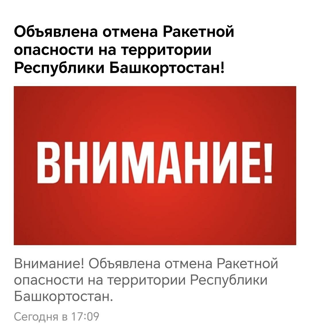 На территории Республики Башкортостан снят режим «Ракетная опасность». Эта информация появилась в приложении «МЧС России». Также о снятии ранее объявленного режима сообщил и председатель госкомитета РБ по ЧС Кирилл Первов Режим «Ракетная опасность» ранее вводили в Саратовской, Оренбургской, Самарской, Пензенской областях, Удмуртии, Пермском крае.