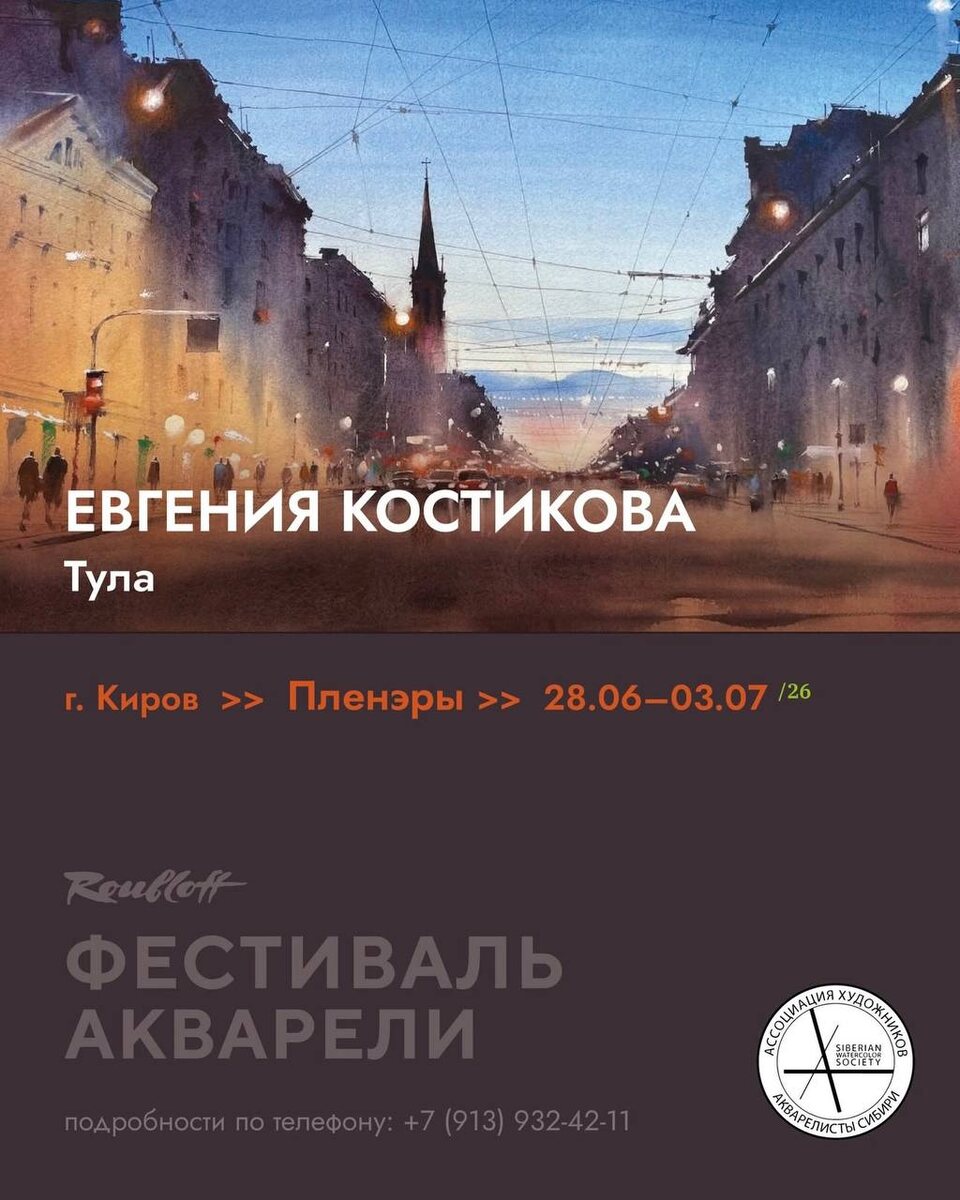 на пленэрах в Кирове покажет, как в городском пейзаже рассказать о своих эмоциях. Евгения художник-акварелист, с 30-летним стажем пленэрной практики. Член Профессионального союза художников России (ПСХР), IWS Globe, Ассоциации Художников «Акварелисты Сибири», Союза Акварелистов России. Призер международных акварельных выставок и фестивалей. Работы находятся в частных коллекциях и фондах в России и за рубежом. С 2018 года руководит студией живописи и рисунка «В облаках» в г.Туле. Проводит в качестве приглашенного художника мастер-классы и пленэры в разных городах России (Москва, Самара, Рязань, Нижний Новгород, Коломна, Калуга, Тула) и за рубежом (Индонезия, Китай). Преподает онлайн в акварельных школах. Приглашаем принять участие в фестивале акварели ROUBLOFF! Пленэры с Евгенией в рамках фестиваля пройдут 28 июня - 3 июля 2026 года. Подробности можно узнать на сайте и по телефону: 89139324211.