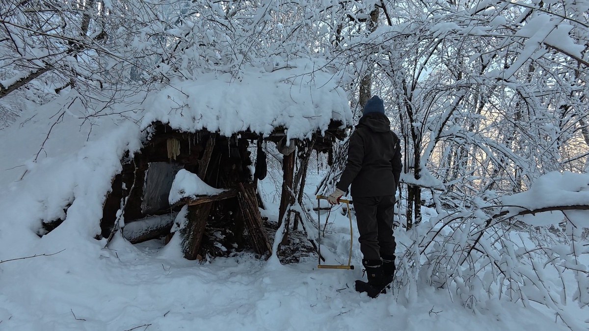 Часть 2. Зеленая Хижина превратилась в Хижину Ледяную Итак, спустя 6 часов ходьбы по сугробам, после преодоления ледяной реки вброд - я таки добралась до своей Зеленой Хижины. Правда, сейчас о зелени хижины ничего не напоминало и она, скорее была похожа на заснеженную берлогу Бабки Ежки из сказки. 😉 Более того, земляной пол внутри, который обычно был плотно утоптанным - теперь был вздыбленным и замерзшим. Было такое ощущение, что через хижину текла река. И спустя несколько дней - я узнала, что так и было. В общем, Зеленая Хижина это вам не Домик из камыша, не добротная деревянная сибирская изба - строение скорее для теплого времени года, чем для холодного. И потому, все последующее прибывание в Хижине уже смело можно было относить к разделу - Выживание. Запас дров в хижине был и я, прежде всего, разожгла огонь в печи. Потом напилась горячей воды из термоса, перекусила. И только потом решила еще напилить дров. Дров в такое время года и в таком строении - много не бывает. Напоминаю, был