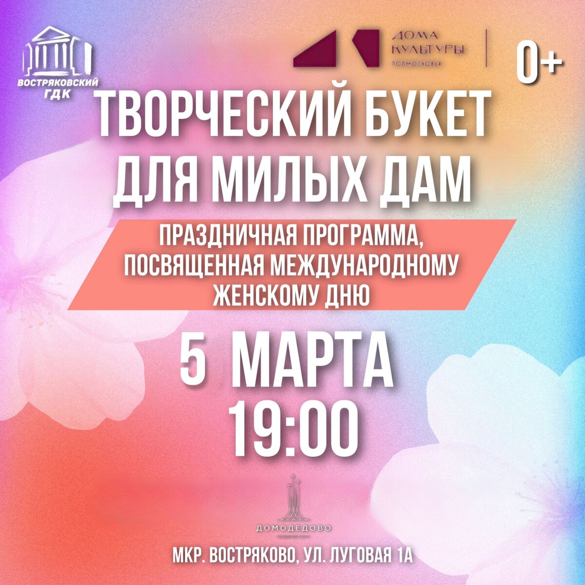 ✨ Приглашаем🧡 В Востряковском ГДК состоится праздничная программа, посвященная международному женскому Дню 🚫 Возраст: 0+ 📆 05.03.2026🕒19:00 🏢 Востряковский городской Дом культуры (ГДК) 📍 г.о.Домодедово, мкрн.Востряково, ул. Луговая,д.1а ✅ Мероприятия Домодедово https://dzen.ru/id/66f10385cc4c5a16f7b5fb02 http://vk.com/domodedovo_events http://dzen.ru/domodedovo_events