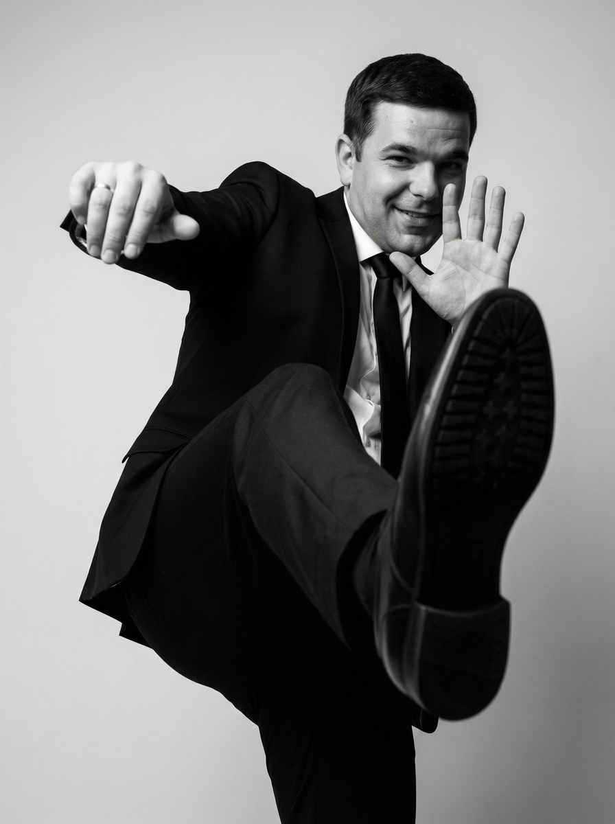 🤖Генерировать можно здесь: 👉БОТ ДЛЯ ГЕНЕРАЦИИ Режим Nano Banana Pro 4К ИНСТРУКЦИЯ Черно-белое студийное фото мужчины с загруженного фото в элегантном черном костюме, белой рубашке и галстуке, выполняющего динамичный жест — он поднимает ногу вперед, демонстрируя подошву туфли, а другой рукой делает «стоп»-жест перед лицом. Его выражение лица — игривое, с легкой усмешкой, взгляд направлен на зрителя. Стиль одежды — классический, строгий, но с элементами неожиданной энергии. Фон — однотонный светло-серый студийный, без деталей, акцентирующий внимание на фигуре. Освещение — мягкое студийное, боковое, создающее четкие тени и объем, подчеркивающие мускулатуру и текстуру ткани. Ракурс камеры — низкий, снизу вверх, что придает позе драматизма и масштаба. Глубина резкости — узкая, фокус на лице и поднятой ноге, остальное слегка размыто. Качество изображения — высокое, детализированное, с чистыми переходами тонов, без шума. Стиль съёмки — современная художественная фотография, смесь формальнос