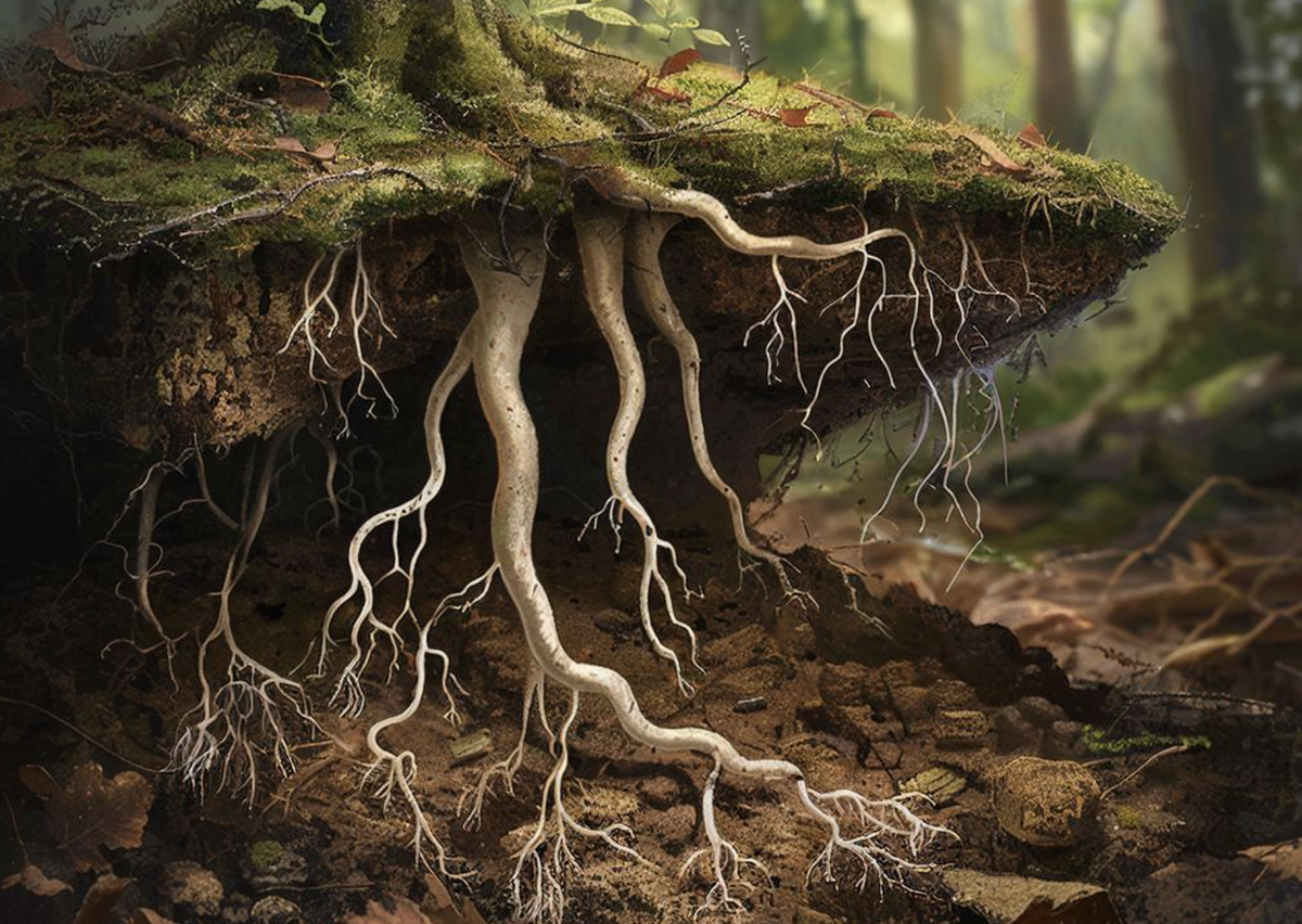 Микориза — это дружба между грибами и растениями, которую они заключают под землей. Представьте себе корни растения и нити гриба, переплетающиеся друг с другом. Грибы помогают растению добывать воду и важные элементы питания, такие как фосфор и азот, из почвы. А растение делится с грибами сахарами, необходимыми для их роста. Слово "микориза" происходит от двух греческих слов: μύκης (mukēs) — гриб,
