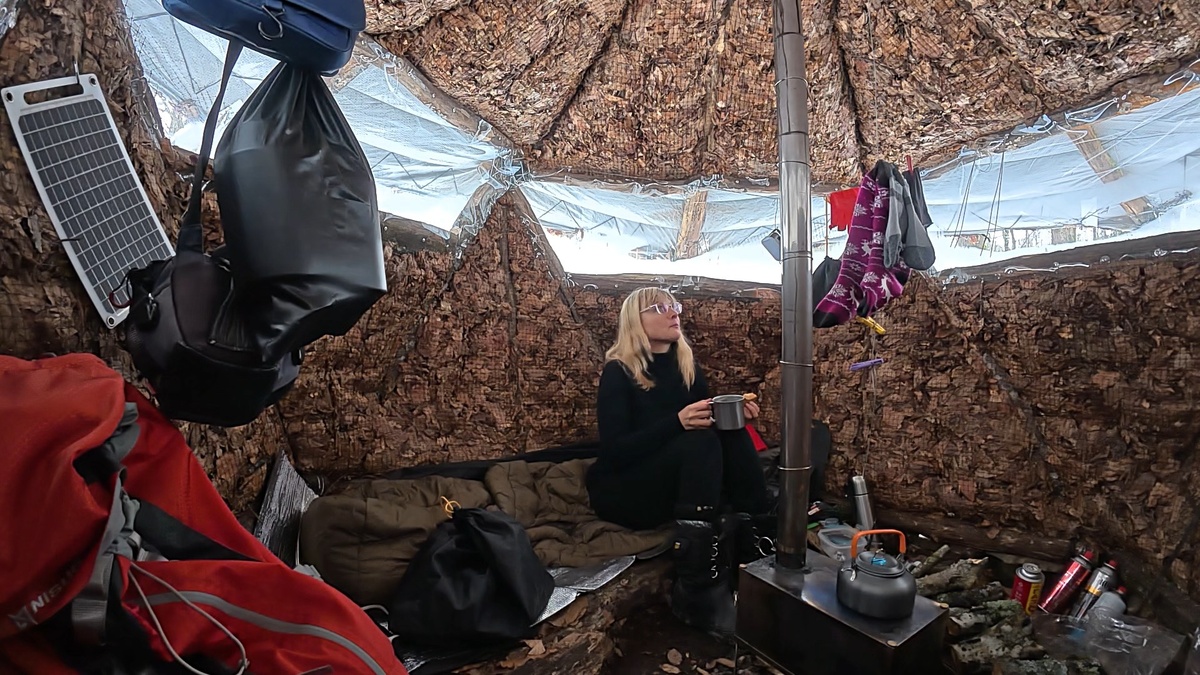 Моя первая ночь в горной хижине прошла комфортно! Горная хижина, не смотря на то, что сделана из листьев, оказалась намного теплее моей Зеленой хижины. Я сразу влюбилась в это удивительное строение. Да, внутри еще не обустроено, но, между тем, уже тепло. Уже есть печь. Можно приготовить пищу, высушить вещи и обогреться самой. В хижине то и дело становилось слишком жарко и я открывала дверь для проветривания. Я часто просто сидела у печи, вытянув ноги. Дверь была открыта и я не уставала наслаждаться пейзажем в дверном проеме. На улице то и дело шел дождь. Снег таял. Со всех склонов, бурными потоками, стекали ручьи. Мне было хорошо, уютно, спокойно! Конечно, я не сидела целый день. Прямо под дождем я бегала собирала и приносила к хижине большие ветки. Пилила дрова. Ходила по склонам и созерцала бурные потоки воды. Понимала, что когда происходит подобное стекание воды - выбраться с гор у меня не получится. Я просто не смогу пересечь реку, в которую, прямо сейчас, текли все эти потоки с ка