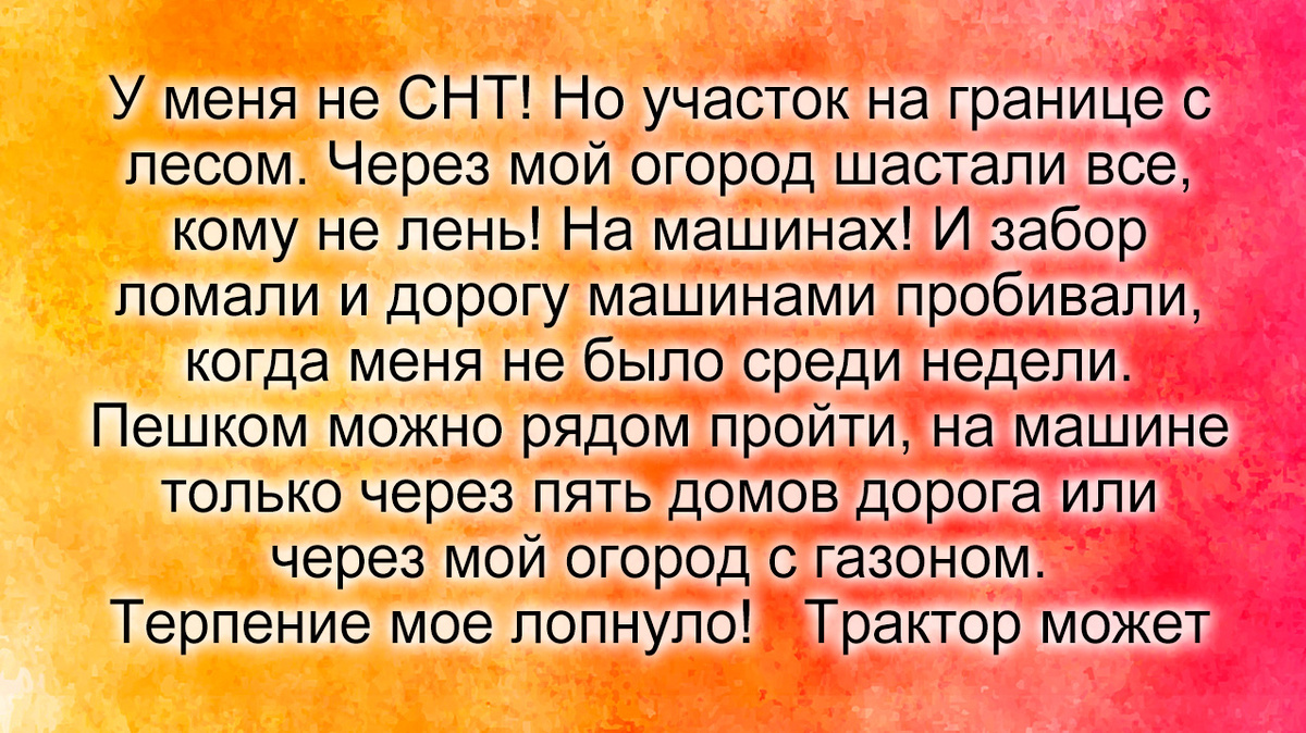 У меня не СНТ! Но участок на границе с лесом и что-то подобное у меня тоже было! Через мой огород шастали все, кому не лень! На машинах! И забор ломали и дорогу машинами пробивали, когда меня не было среди недели. Пешком можно рядом пройти, на машине только через пять домов проезд или через мой огород с газоном.