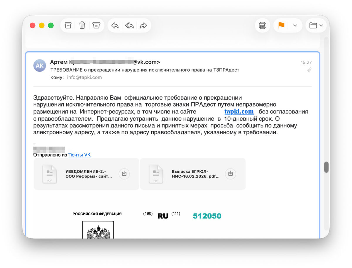 Кажется так советуют юристы... Вон, нам на tapki.com прилетело :) Странно, мы точно не конкурент. Русский ИТ бизнес +✅Мы в MAX