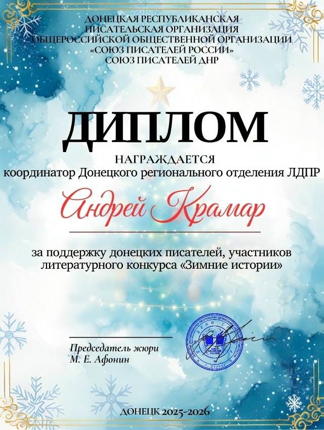 Координатор ЛДПР в ДНР Андрей Крамар и депутат Тельмановского муниципального совета Владислав Брюхань были награждены дипломами Союза писателей ДНР за поддержку творческих людей региона в рамках литературного конкурса «Зимние истории». ♥️ Признание от донецких авторов стало очередным подтверждением того, что ЛДПР неизменно стоит на страже культурного возрождения Донбасса. Члены Союза писателей ДНР отметили, что ЛДПР уже не в первый раз берут на себя заботу о талантливых земляках. Ранее активисты партии передали подарки писателям, среди которых был знаковый труд Основателя ЛДПР Владимира Жириновского «Мои прогнозы сбылись». ⚡️ЛДПР остается надежным партнером для тех, кто вкладывает свои силы и ресурсы в сохранение Русского слова и культурного кода Донбасса. 🟪 Подписывайтесь на нас в МАХ