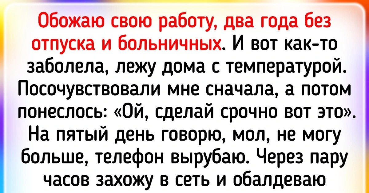 Обожаю свою работу, два года без отпуска и больничных. И вот как-то заболела, лежу дома с температурой. Посочувствовали мне сначала, а потом понеслось: «Ой, сделай срочно вот это». На пятый день говорю, мол, не могу больше, телефон вырубаю. Через пару часов захожу в сеть и обалдеваю, там сообщение: «Не ожидали такого от тебя. Ты сейчас очень всех подставила». Теперь не знаю, что делать и как после больничного возвращаться в офис.
