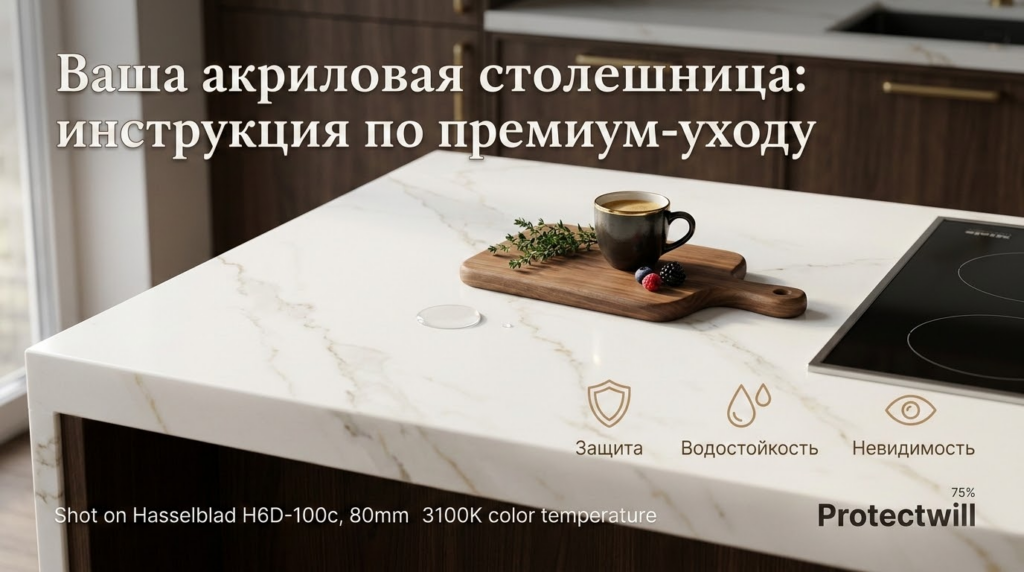 Столешницы из акрилового камня (Corian, Staron, Hi-Macs и др.) — это стандарт качества для современных премиальных кухонь. Материал ценится за отсутствие пор, гигиеничность и возможность создания бесшовных форм. Однако, несмотря на прочность, акрил — достаточно мягкий материал, чувствительный к царапинам и высоким температурам.