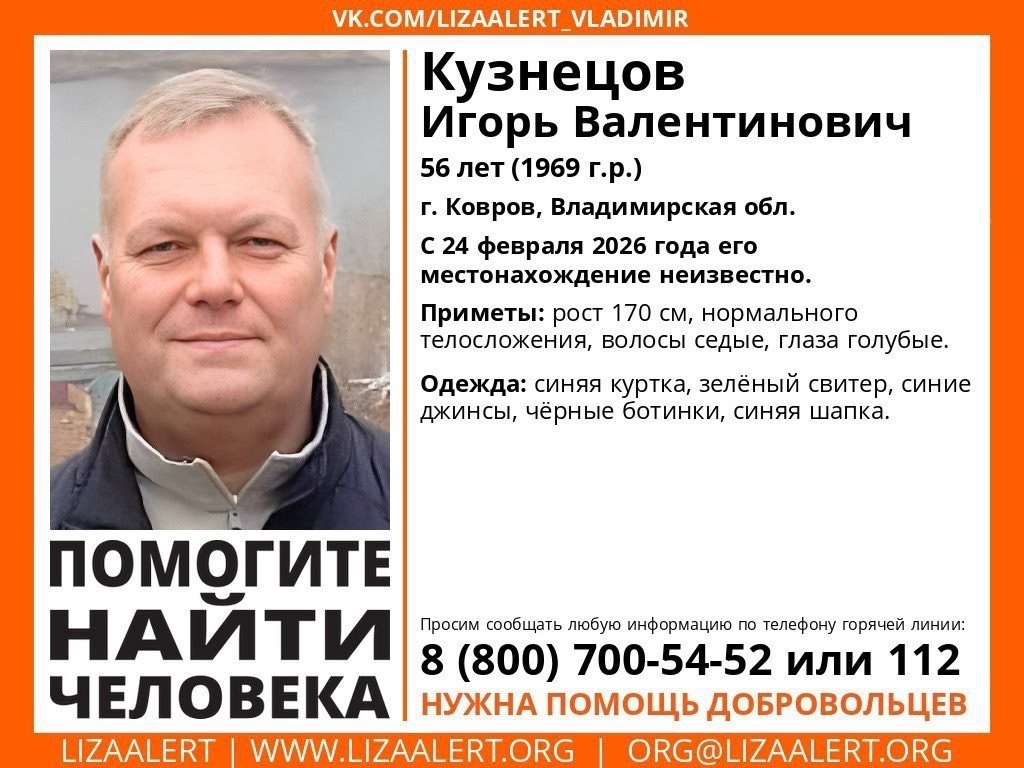 ! Пропал Кузнецов Игорь Валентинович 1969 г.р. (56 лет), г. Ковров, Владимирская обл. С 24 февраля 2026 года его местонахождение неизвестно. Приметы: рост 170 см, нормального телосложения, волосы седые, глаза голубые. Был одет: синяя куртка, зелёный свитер, синие джинсы, чёрные ботинки, синяя шапка. Написать нам: @alexlivebot Подпишитесь на –@alexautolive Канал в MAX – max.ru/alexautolive
