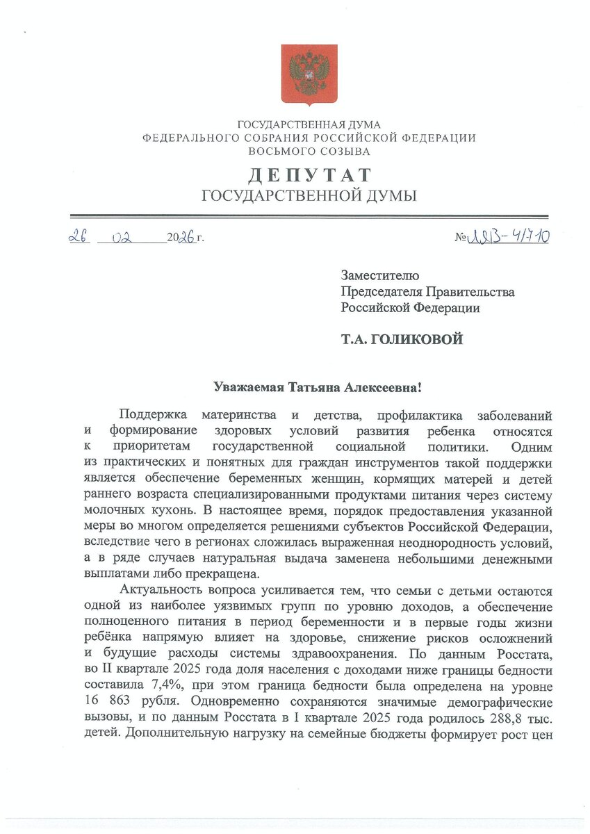 ввести единый федеральный стандарт обеспечения беременных женщин, кормящих матерей и детей до трех лет специализированным питанием через молочные кухни. Сейчас эта поддержка зависит от региона: где-то семьи получают качественные продукты, а где-то — символические выплаты или вообще ничего. Это недопустимо, когда речь идет о здоровье будущих поколений. 📑По данным Росстата, почти 7,4% населения живет за чертой бедности, а цены на продукты в 2025 году выросли на 5,2%. Полноценное питание в первые годы жизни ребенка является базовой потребностью, от которой зависят и здоровье матери, и развитие малыша, и будущие расходы системы здравоохранения. Мы предлагаем закрепить молочные кухни как обязательную федеральную меру поддержки, установить единые минимальные нормы выдачи, сроки назначения и требования к качеству продукции — при этом сохранив право регионов расширять помощь сверх стандарта. 📌Особенно важно сохранить натуральную форму выдачи, а не заменять ее деньгами. Только так можно г