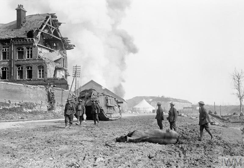 Танк Mark IV проезжает через Перонн, Франция, 23 марта 1918 года