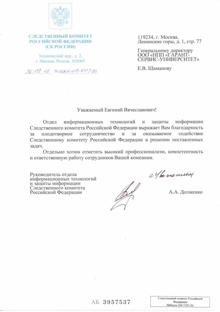 Следственный комитет РФ выразил благодарность компании «Гарант»