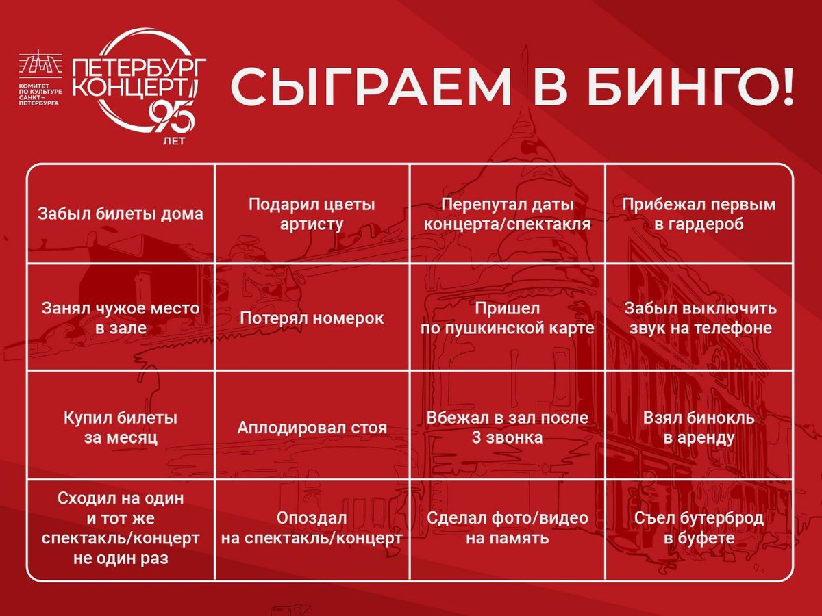 Быть зрителем — это тоже искусство! 🎭 Собрали для вас самое жизненное «Бинго зрителя Петербург-концерта».